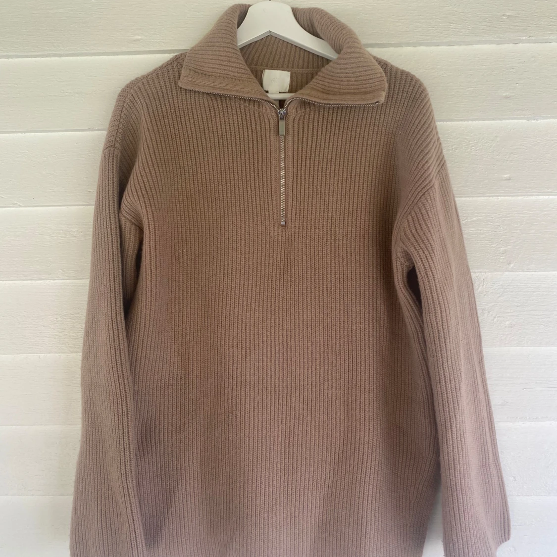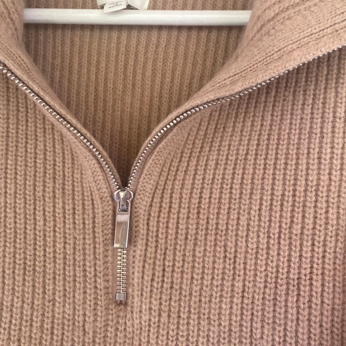 Säljer en supermysig beige stickad tröja med dragkedja framtill. Perfekt för kyliga dagar med sin långa passform och ribbade struktur. Tröjan har långa ärmar och en bekväm krage som kan justeras med dragkedjan. Passar perfekt till både vardag och mysiga hemmakvällar.