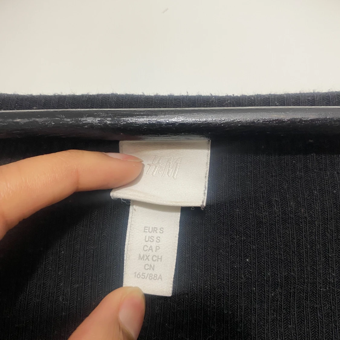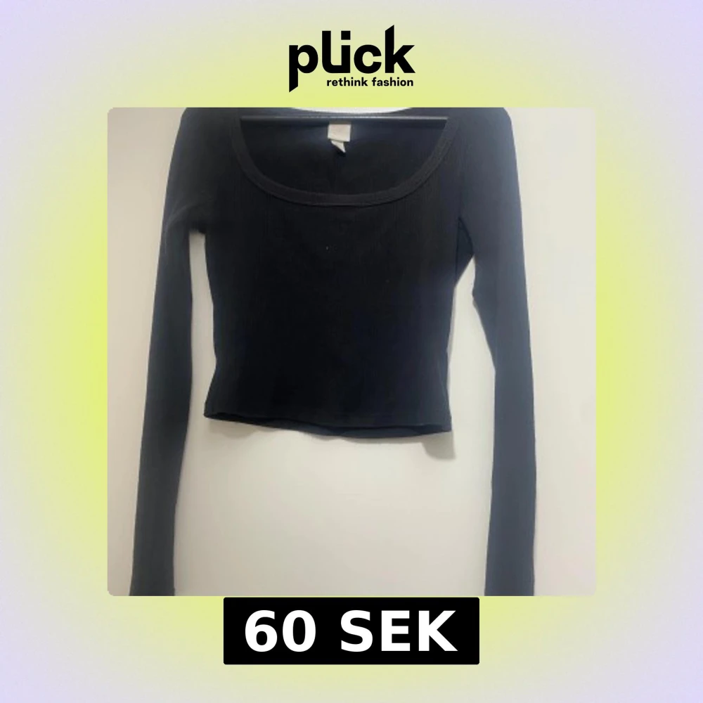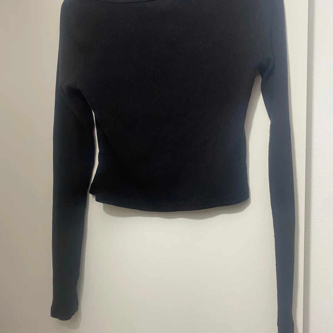 En svart, ribbad långärmad topp från H&M med rundad, bred urringning. Modellen är figurnära och croppad, perfekt att styla med höga jeans eller kjol. Mjuk och stretchig i bomullsmix för en bekväm känsla hela dagen.