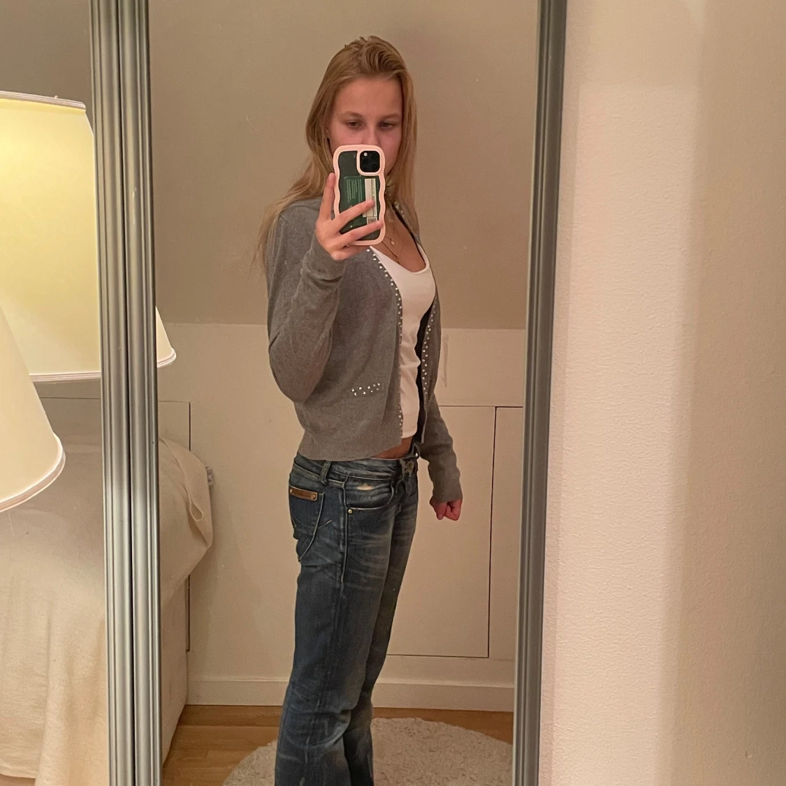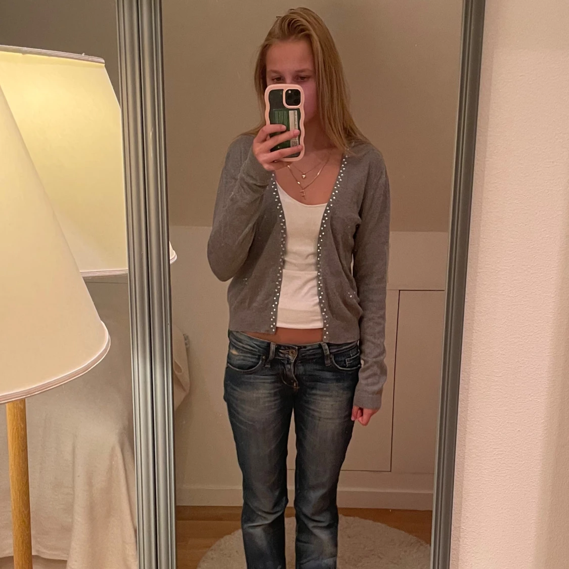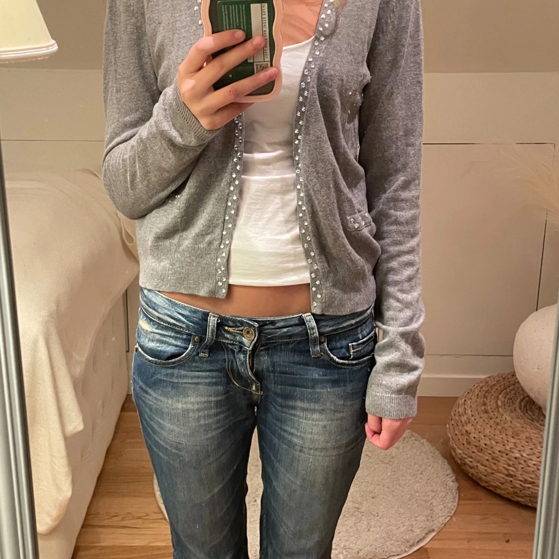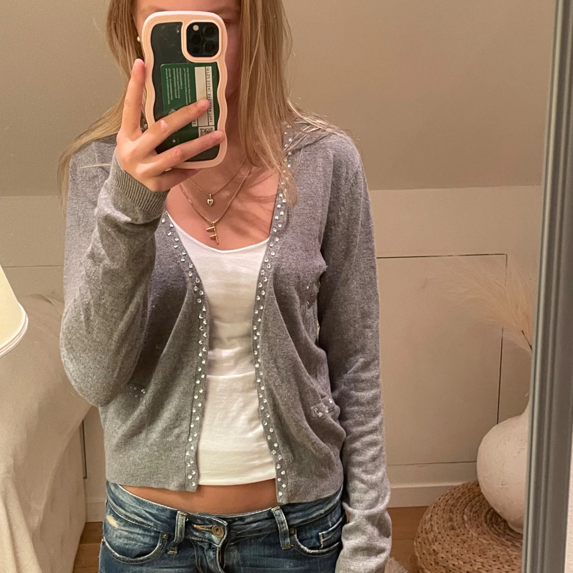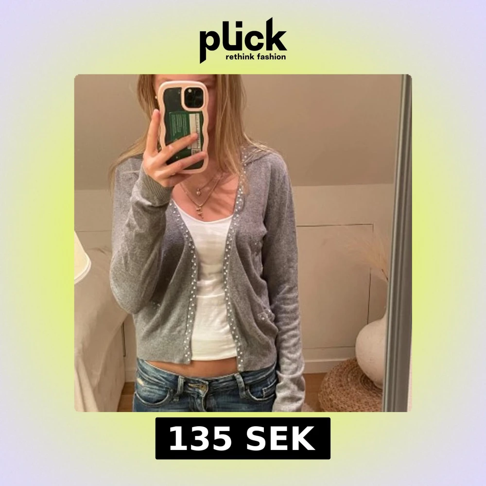 Grå kofta med långa ärmar och pärldetaljer längs knäppningen. Modellen är croppad och har ribbade muddar vid ärmslut och nederkant. Perfekt att slänga över ett linne. Materialet är mjukt💕