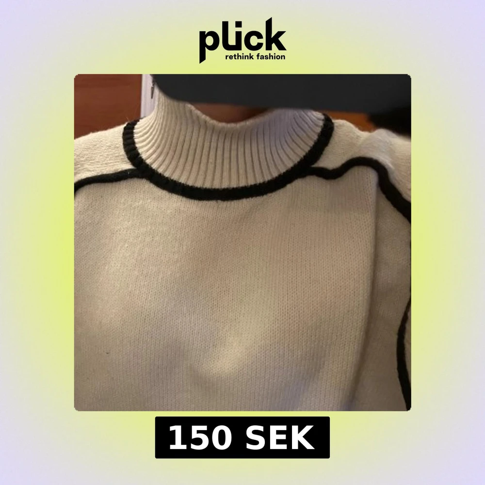 Snygg beige polotröja med svarta kontrastdetaljer längs krage, axlar, ärmslut och nederkant. Tröjan är stickad och har en ribbad hög krage samt långa ärmar. Perfekt för dig som gillar enkel men stilren design med lite edge.