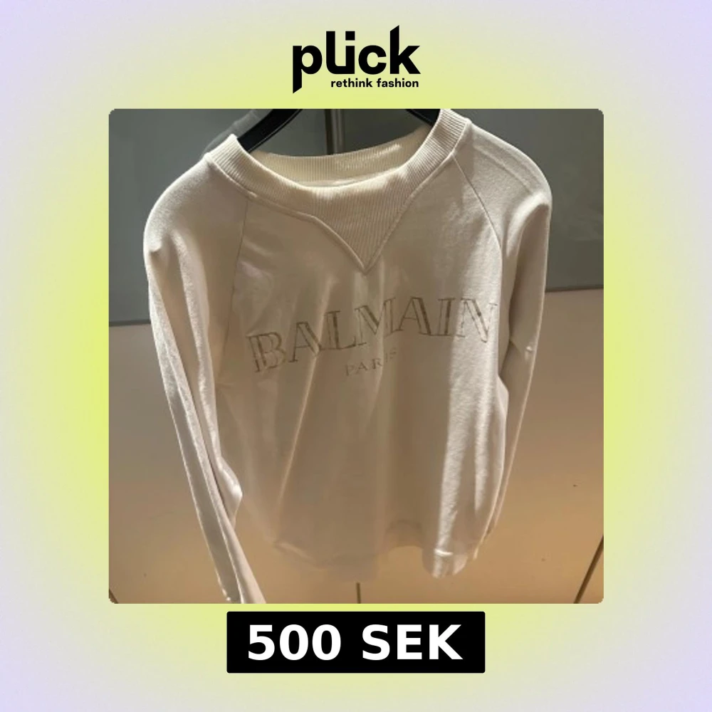 Säljer en stilren vit tröja från Balmain med deras logga tryckt på framsidan. Tröjan har långa ärmar och en ribbad krage som ger en klassisk look. Perfekt för dig som vill ha något enkelt men ändå exklusivt.