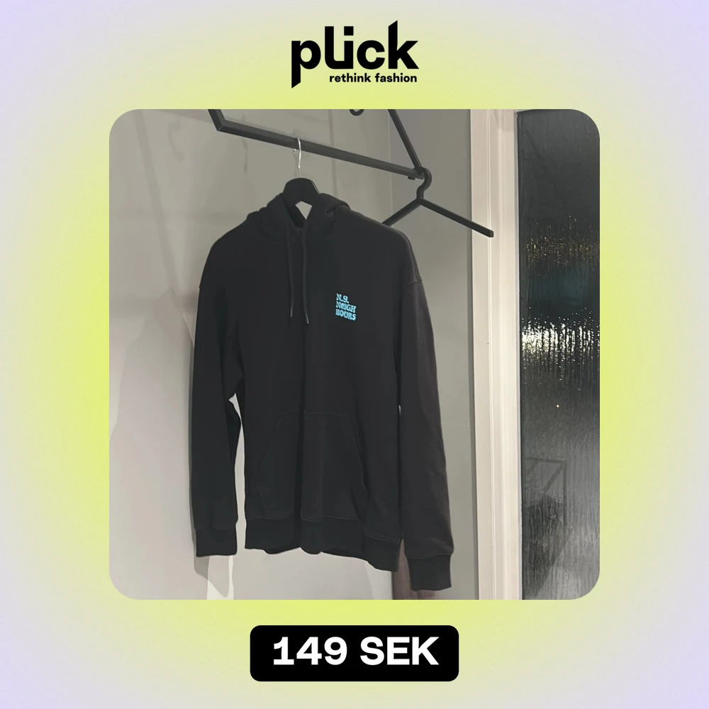Säljer en svart hoodie från H&M i storlek S. Den har ett coolt tryck i turkos på baksidan och text på framsidan. Perfekt för en avslappnad stil med sin relaxed fit. Grym för höst och vinter!