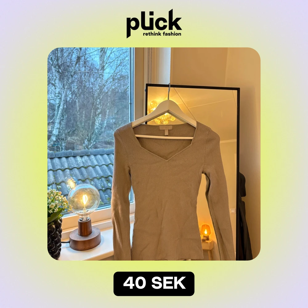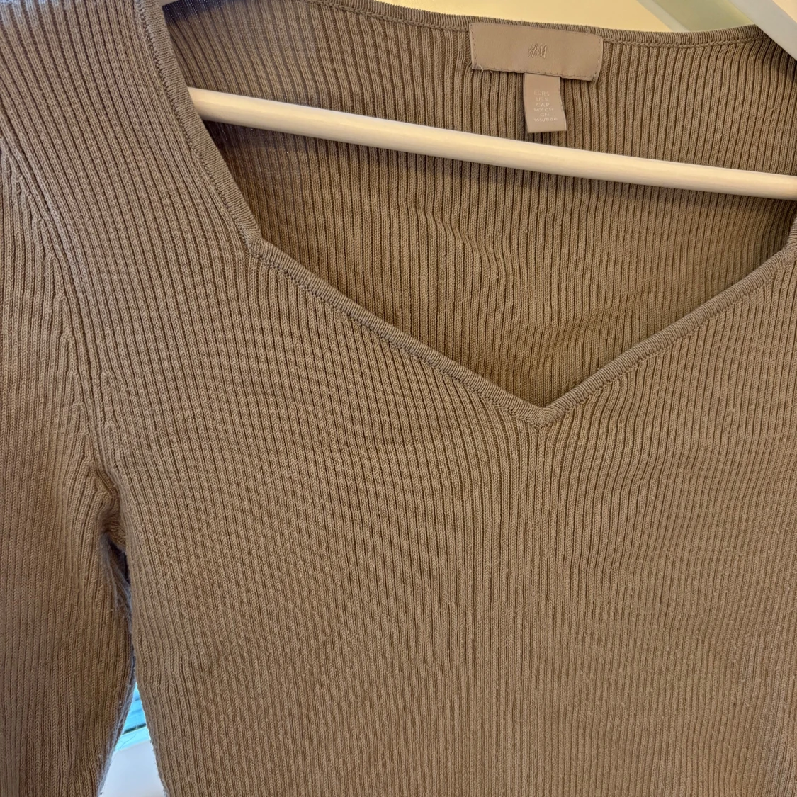 Säljer en snygg beige ribbad tröja från H&M. Den har en v-ringad hals och långa ärmar, Tröjan är i bra skick. Fin passform