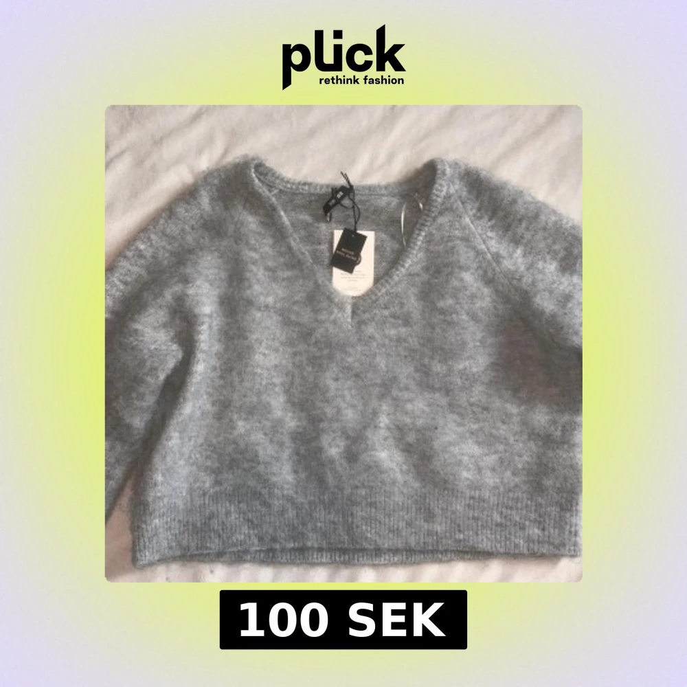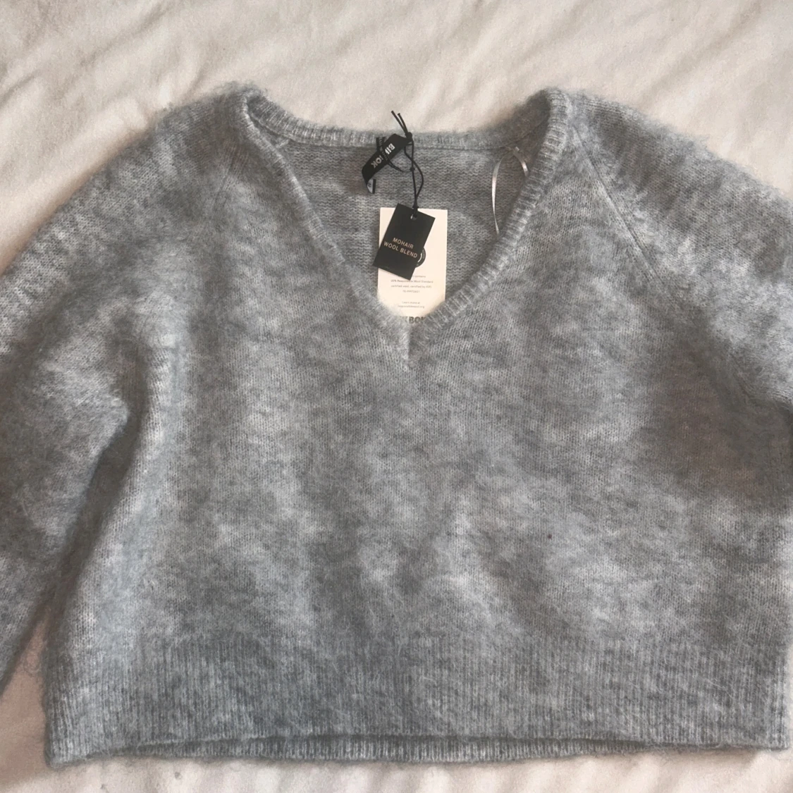 Supermjuk ljusgrå stickad tröja från bikbok med v-ringning och lång ärm. Tröjan har en fluffig känsla och ribbade muddar vid ärmslut och nederkant.