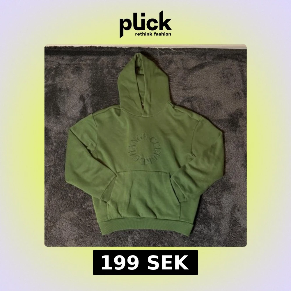 Säljer en snygg grön hoodie med broderad text på bröstet. Den har en klassisk känguruficka och en bekväm huva. Perfekt för en avslappnad stil. Passar bra till jeans eller joggers. Tröjan är i storlek S och har en cropped passform.