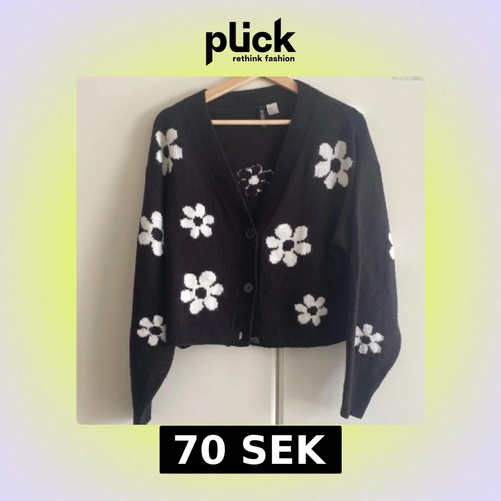Superfin svart kofta från h&m med stora vita blommor över hela tröjan. Koftan har v-ringning, knappar framtill och är lite croppad i modellen. Perfekt för att liva upp din outfit med ett lekfullt mönster och sköna vibbar.