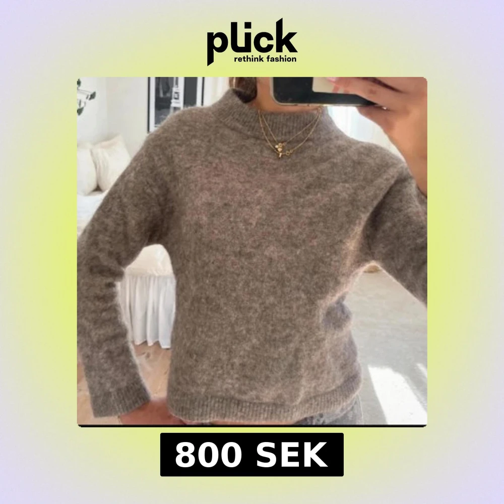 Mysig brun stickad tröja med hög ribbad krage och långa ärmar. Tröjan har en enkel och stilren design med ribbade muddar vid ärmslut och nederkant. Perfekt för lager-på-lager under kyliga dagar.