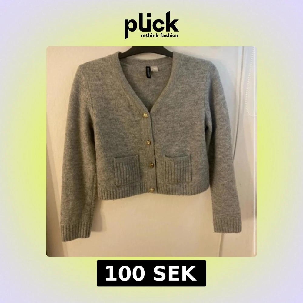 Mysig grå kofta från H&M med v-ringning och guldknappar framtill. Tröjan har två ribbade fickor och ribbade muddar vid ärmslut och nederkant.