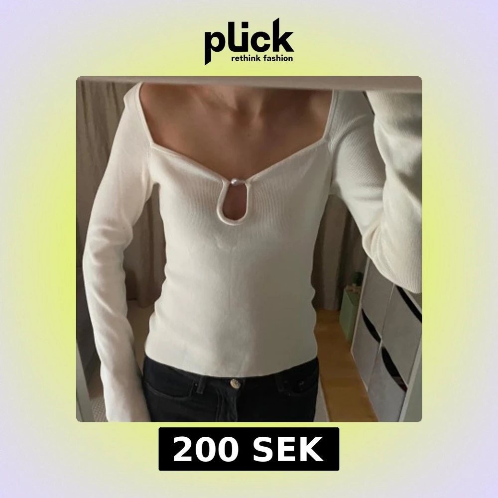 Säljer en stilren vit ribbad tröja med offshoulder-design och långärmade ärmar. Snygg detalj med pärlan i fram. Fint skick!