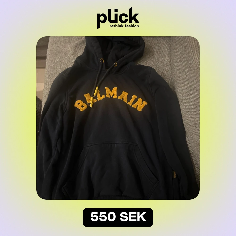 Säljer en snygg svart hoodie från Balmain med gul text på bröstet. Den har en klassisk känguruficka och justerbar huva med snören. Perfekt för en casual look eller att mysa i hemma. Passar bra till både jeans och andra . Använd några gånger.