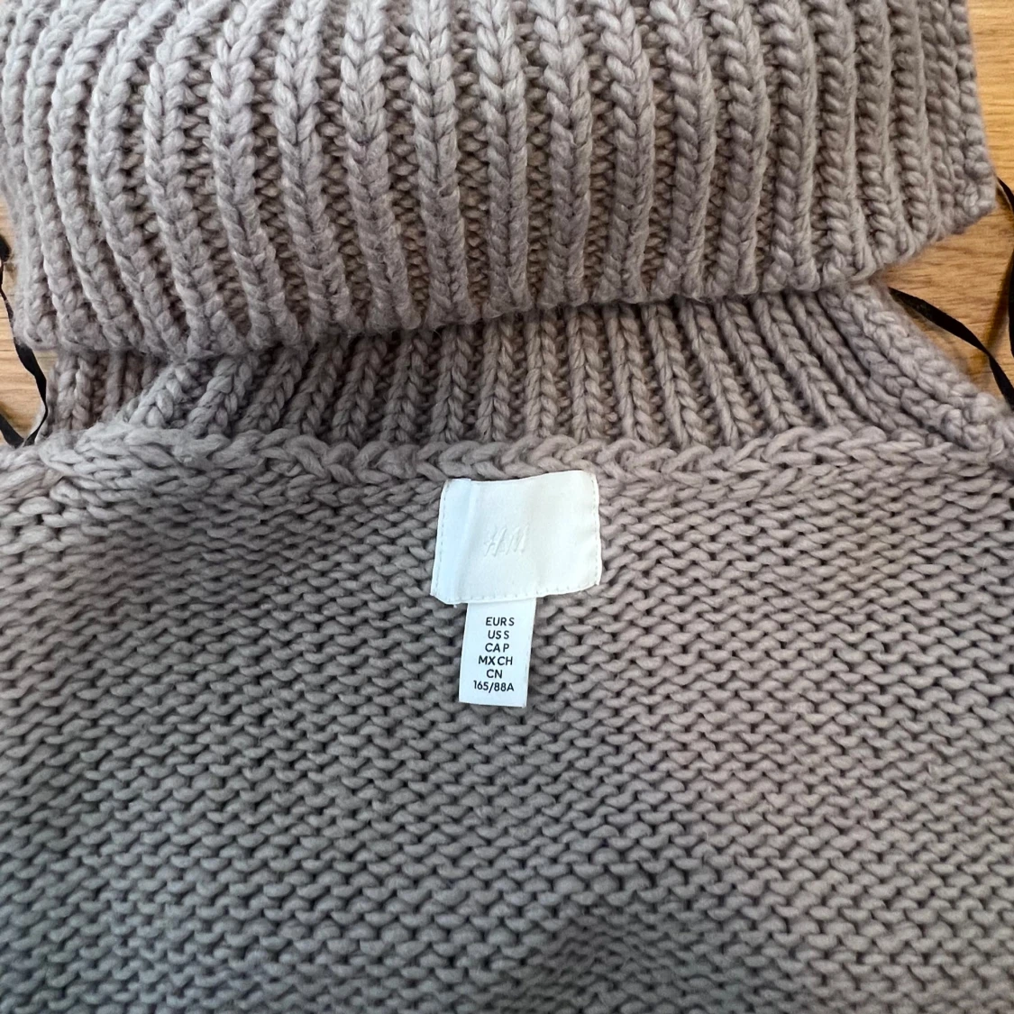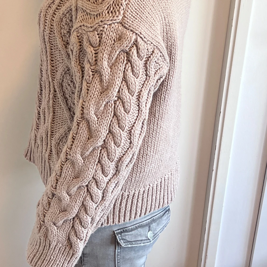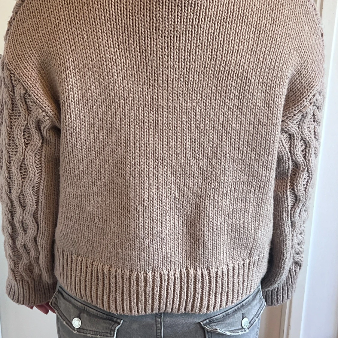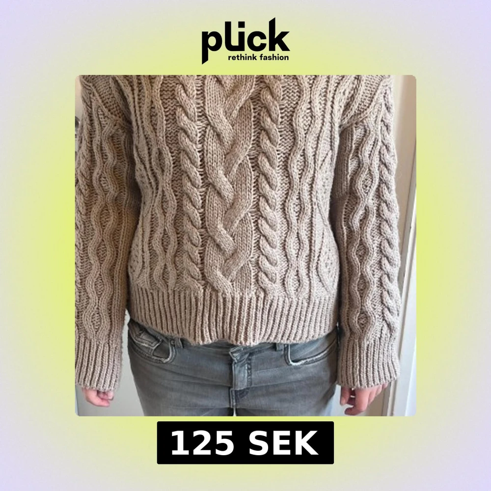 Säljer en chunky beige kabelstickad tröja från H&M. Tröjan har grova flätmönster framtill och på ärmarna, samt ribbade muddar och nederkant. Perfekt för lager-på-lager och ger en mysig vibe till din outfit.
