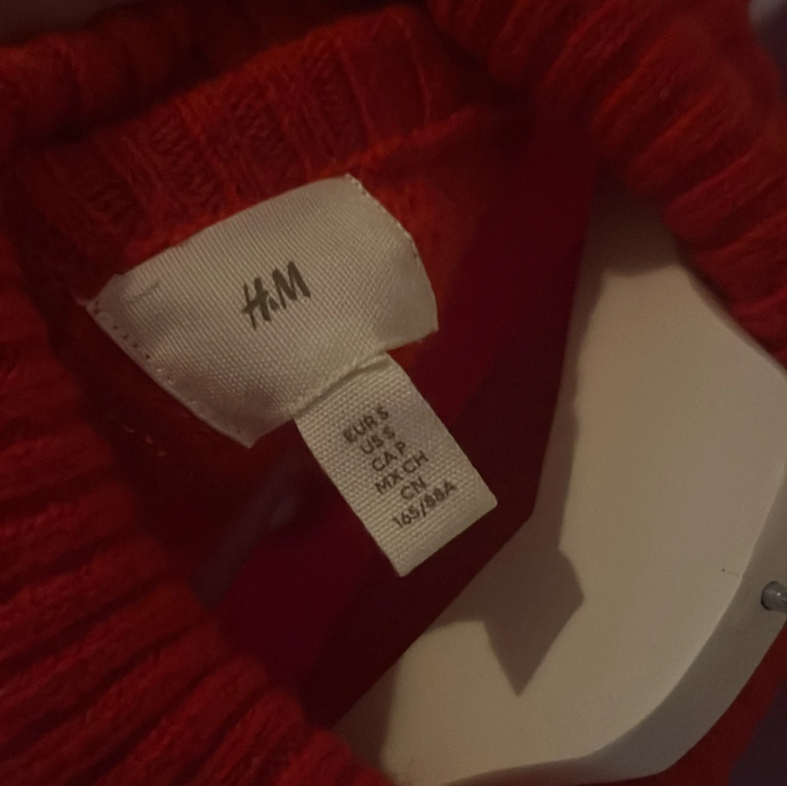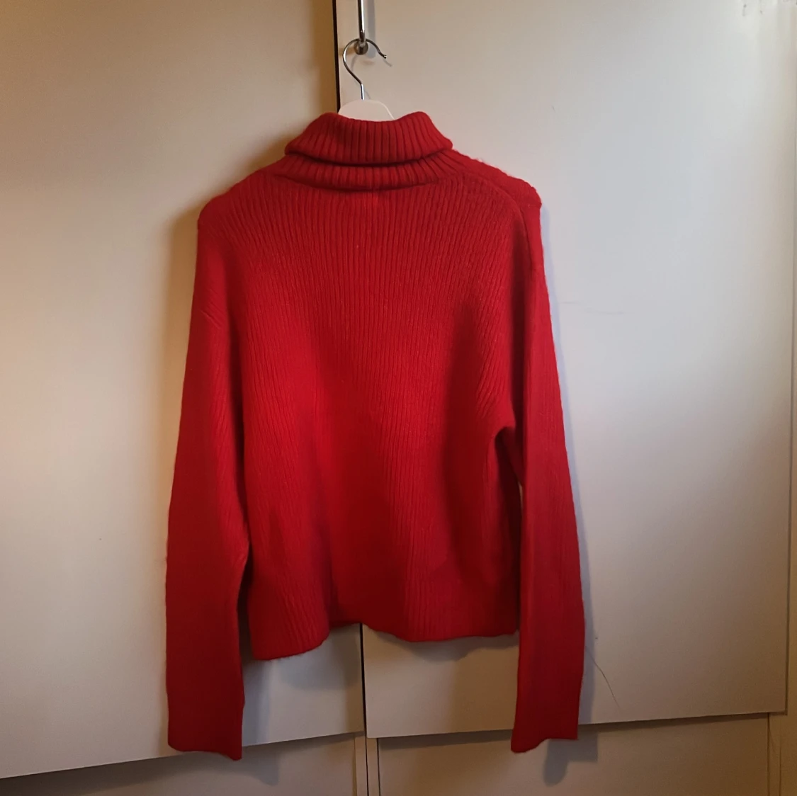 Säljer en snygg röd stickad polotröja från H&M. Tröjan har en hög polokrage och långa ärmar, perfekt för kyliga dagar. Den är ribbad vilket ger en fin textur och stil. Passar utmärkt till både jeans och kjol. Använd en gång. ‼️pris kan diskuteras‼️