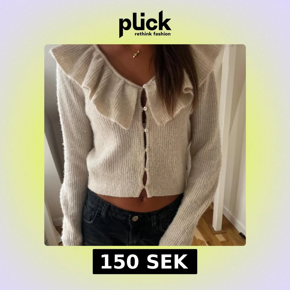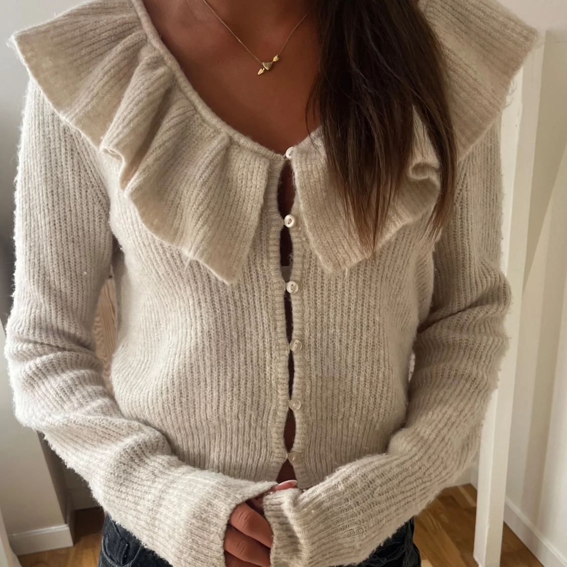 Superfin beige kofta med stora volanger längs kragen och knäppning framtill. Stickad i mjukt material och har en croppad passform.