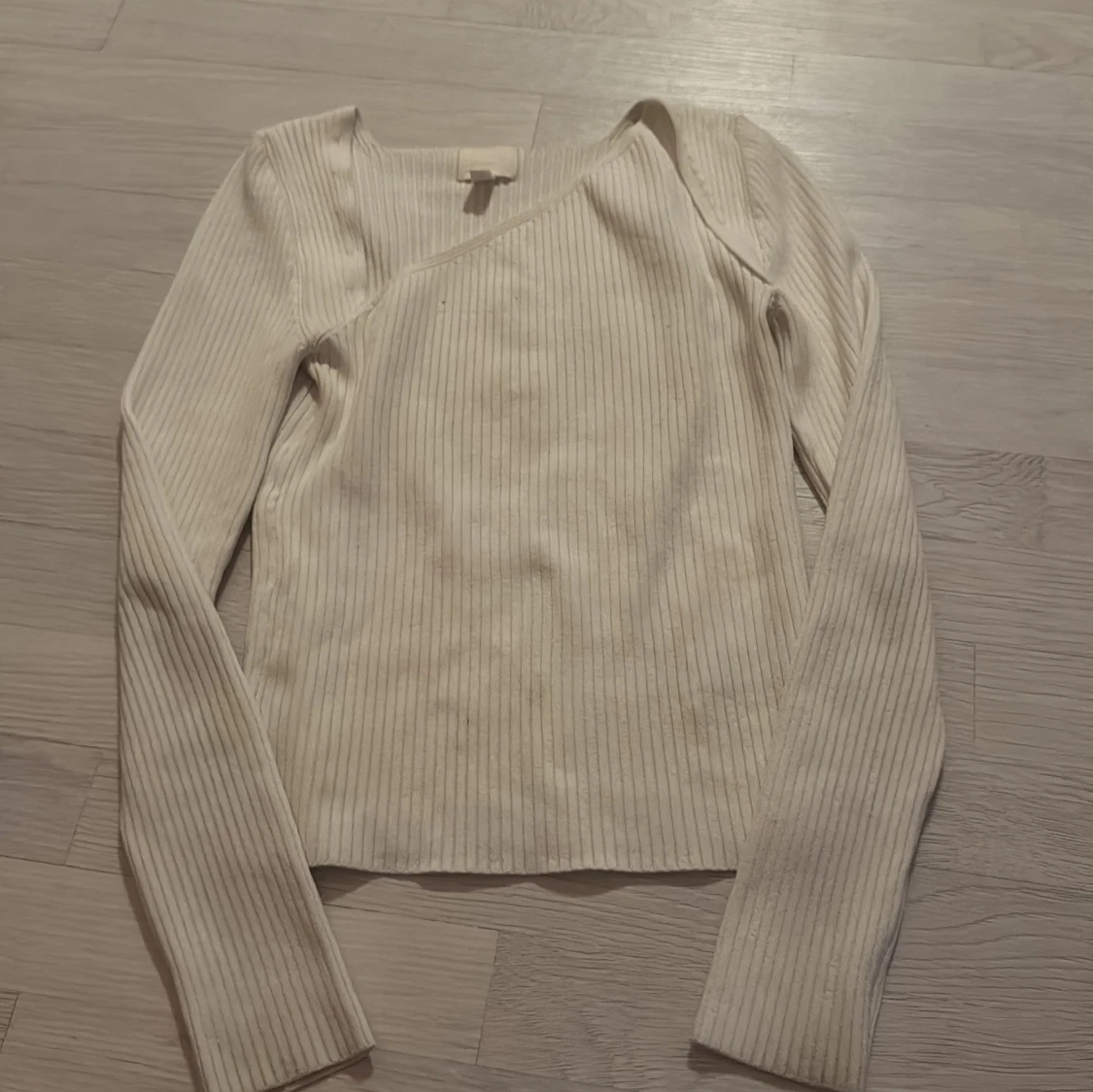 Säljer en vit ribbad tröja med lång ärm och snygg asymmetrisk halsringning. Tröjan är i mjukt material och har en stilren look som passar perfekt till jeans eller kjol. Enkel att matcha och superbekväm för alla tillfällen.