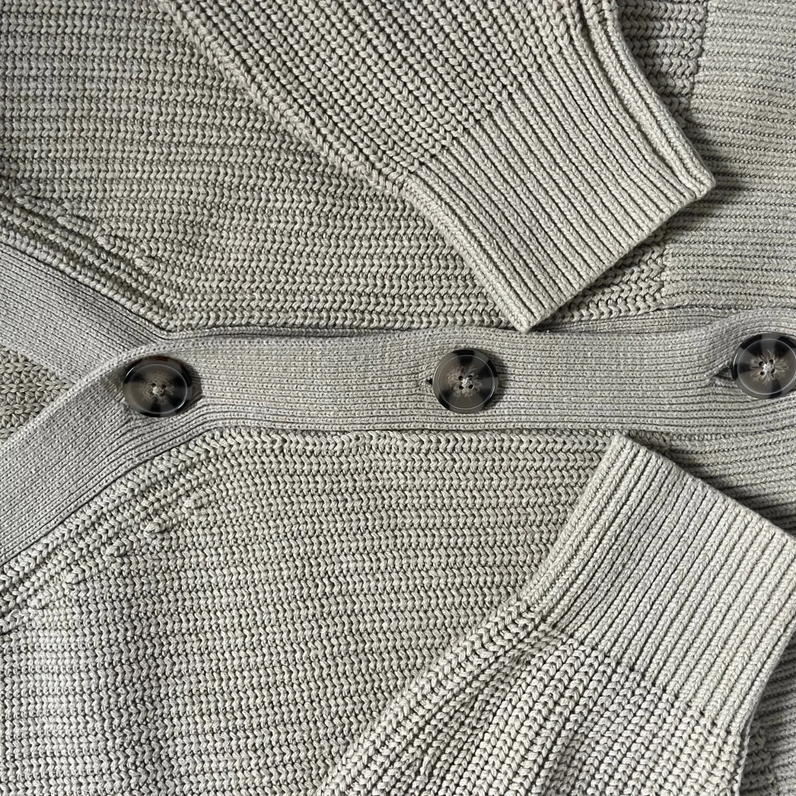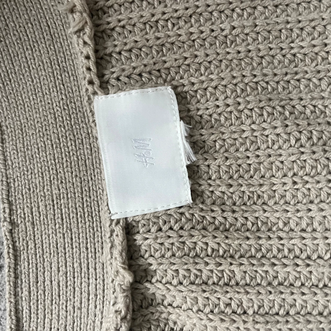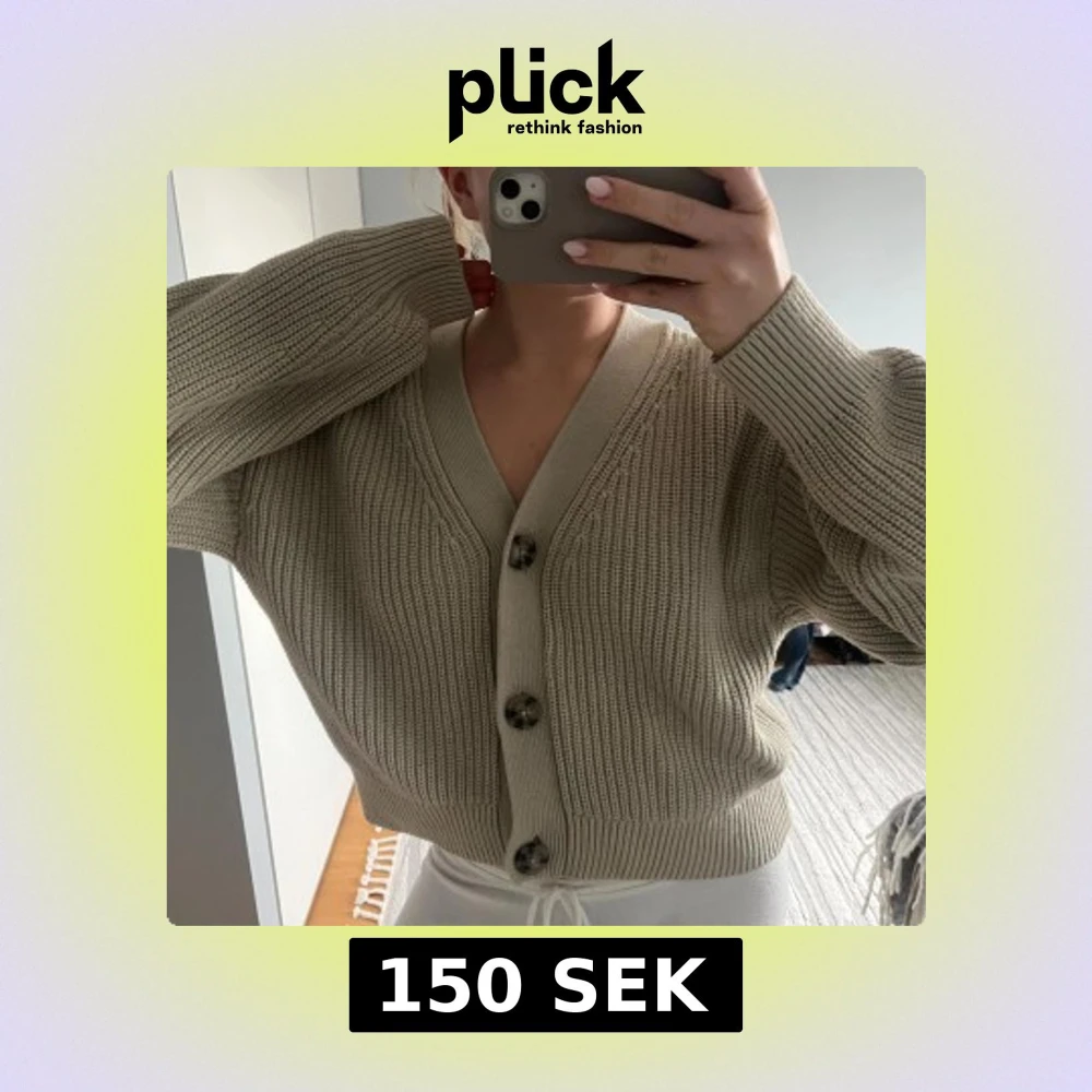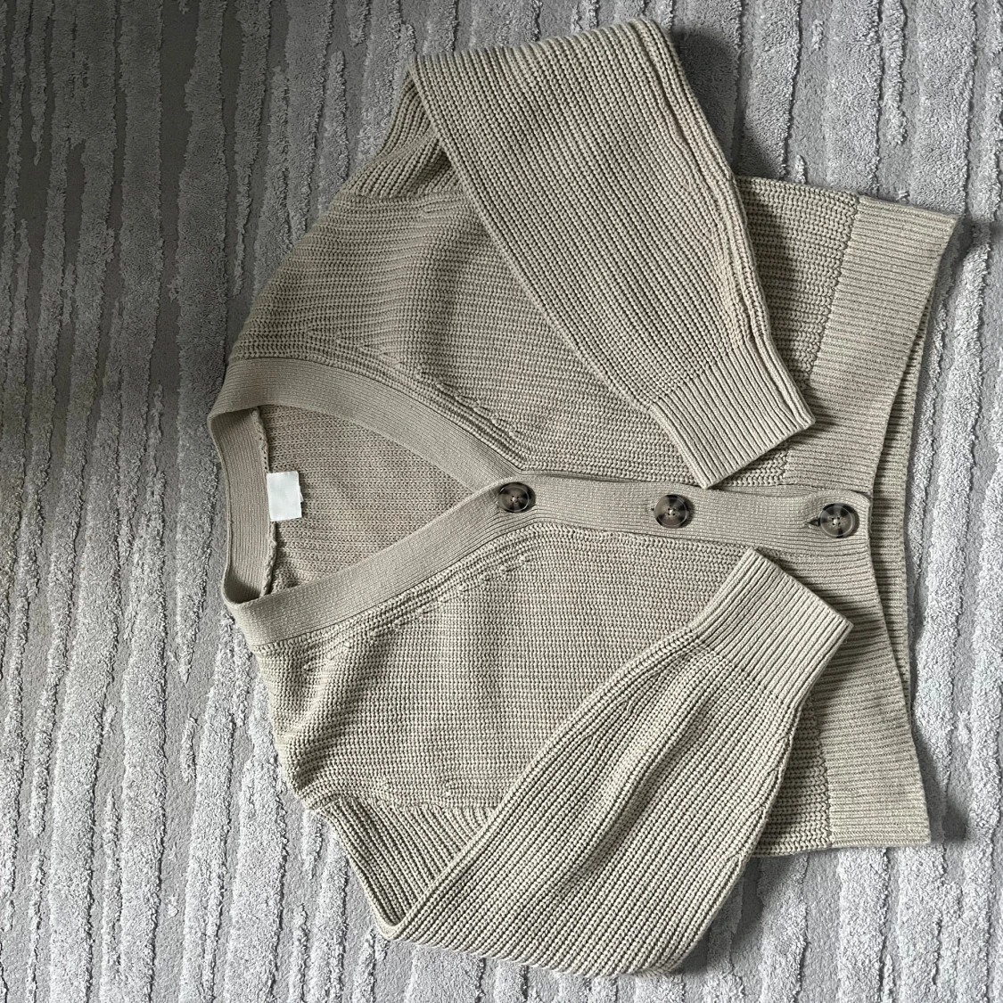 Säljer en beige stickad kofta från HM med grov ribbad struktur och stora mörka knappar framtill. Koftan har v-ringad hals och långa ärmar med breda muddar. Perfekt för lager-på-lager och chill stil.