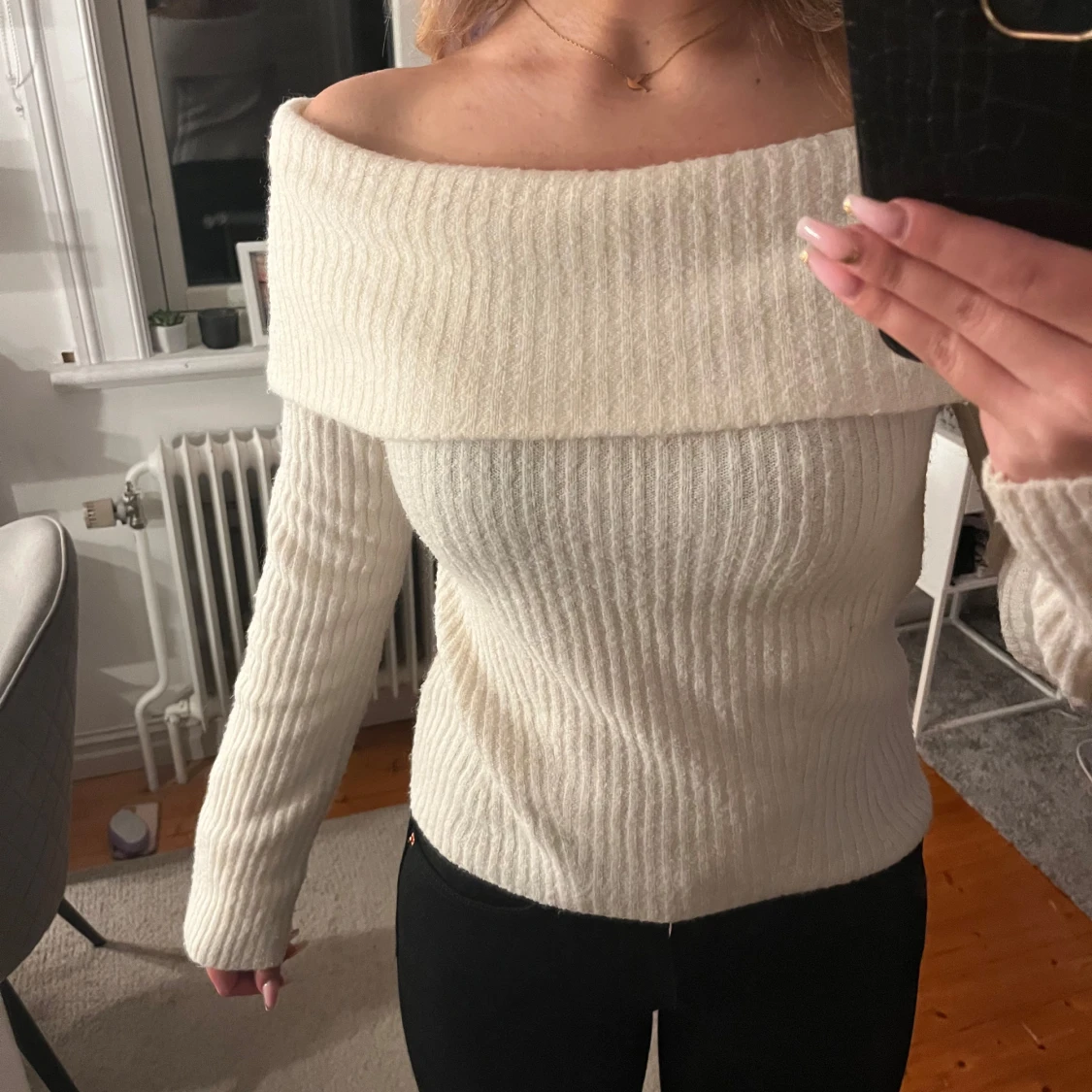 Säljer en superfin vit stickad offshoulder-tröja. Den är perfekt för både höst och vinter. Supermysigt material. Säljer pga den har inte kommit till så mycket användning💗