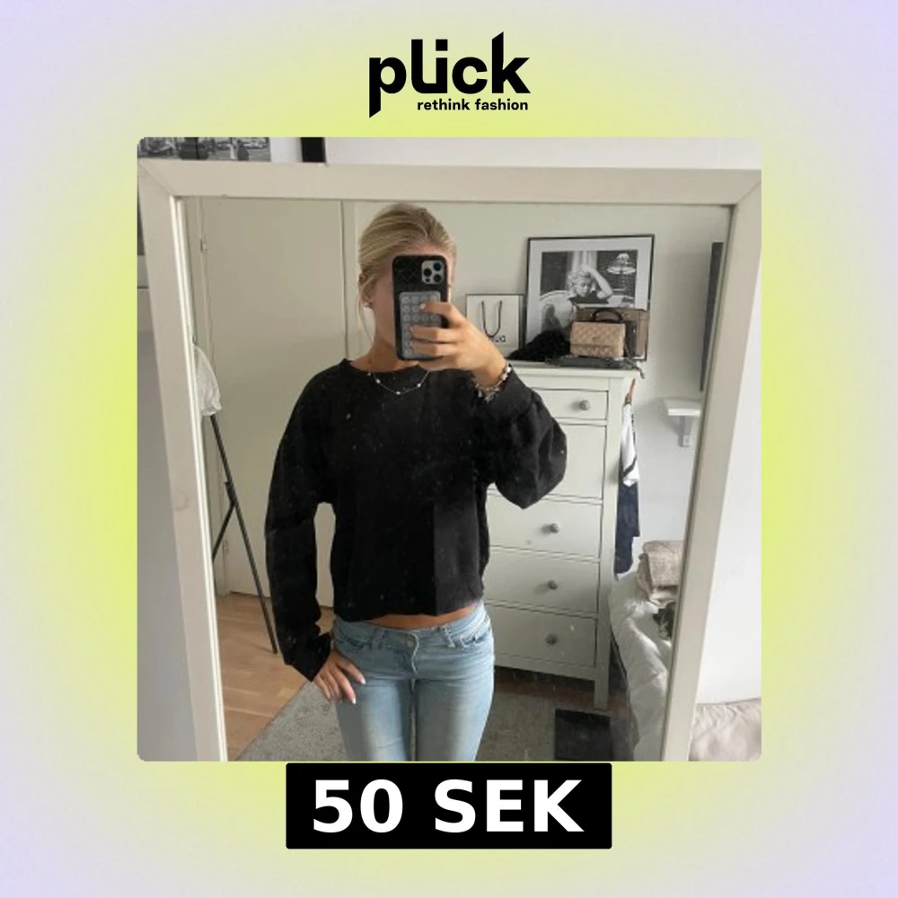 Svart croppad sweatshirt med rund hals och långa ärmar. Tröjan har en loose passform och är tillverkad i mjukt bomullsmaterial. Perfekt för en chill och avslappnad stil, enkel att matcha med jeans eller leggings.