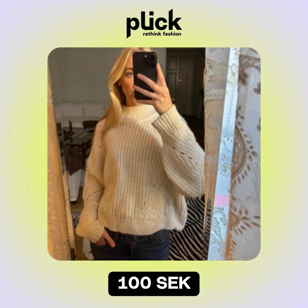 En stickad tröja från hm i en benvit/gul färg köptes för några år sedan och är i använt skick men sparsamt använd, inga fläckar eller liknande med kommer☺️den är vid i armarna och väldigt mjuk i materialet, höst tröja🍁🧸