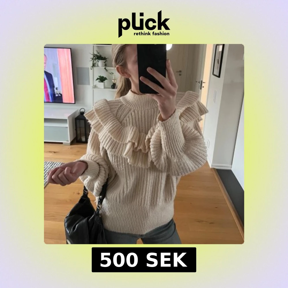 Säljer en superfin beige stickad tröja med volangdetaljer över bröstet och axlarna. Tröjan har långa ärmar och en ribbad struktur som ger en mysig känsla. Super snygg till både vardags och till finare tillställningar! Nästan aldrig använd så är i superfint skick!!💕