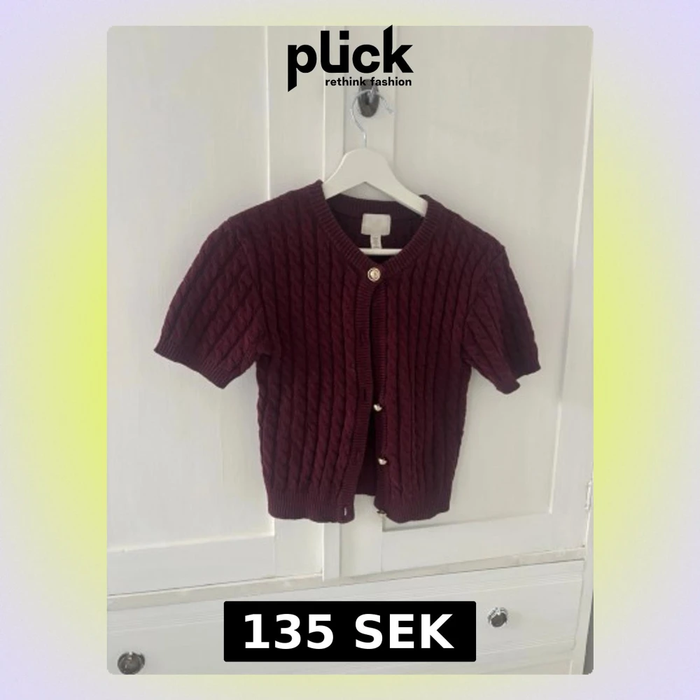 Kortärmad vinröd kofta från H&M med rund halsringning och guldfärgade knappar framtill. Tyvär har en knapp trillat av men anars i fint skick