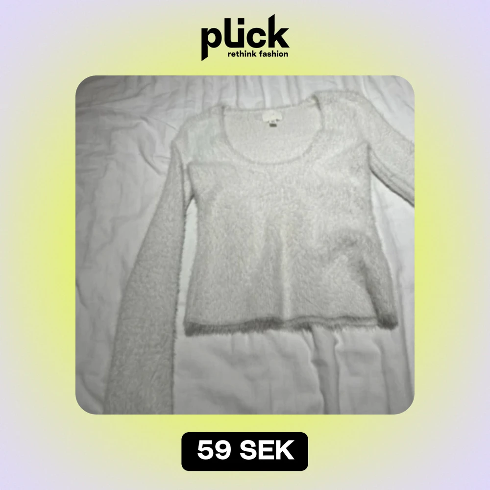 Väldigt söt vit fluffig tröja med urringning från H&M. Använd ett fåtal gånger alltså fint skick.