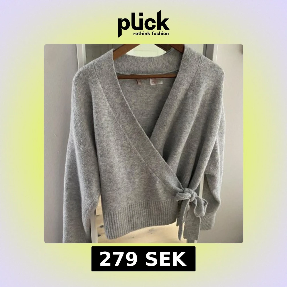 Mysig grå kofta från H&M i omlottmodell med knyt i sidan. Koftan har lång ärm och bred ribbad kant nedtill. Perfekt för lager-på-lager och chill dagar. Superenkel att matcha med jeans eller kjol.