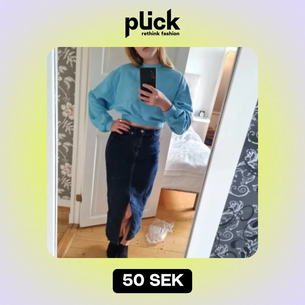 Cool blå tjocktröja som är väldigt skön att ha på sig och passar till ett par högmidade byxor eller kjol.