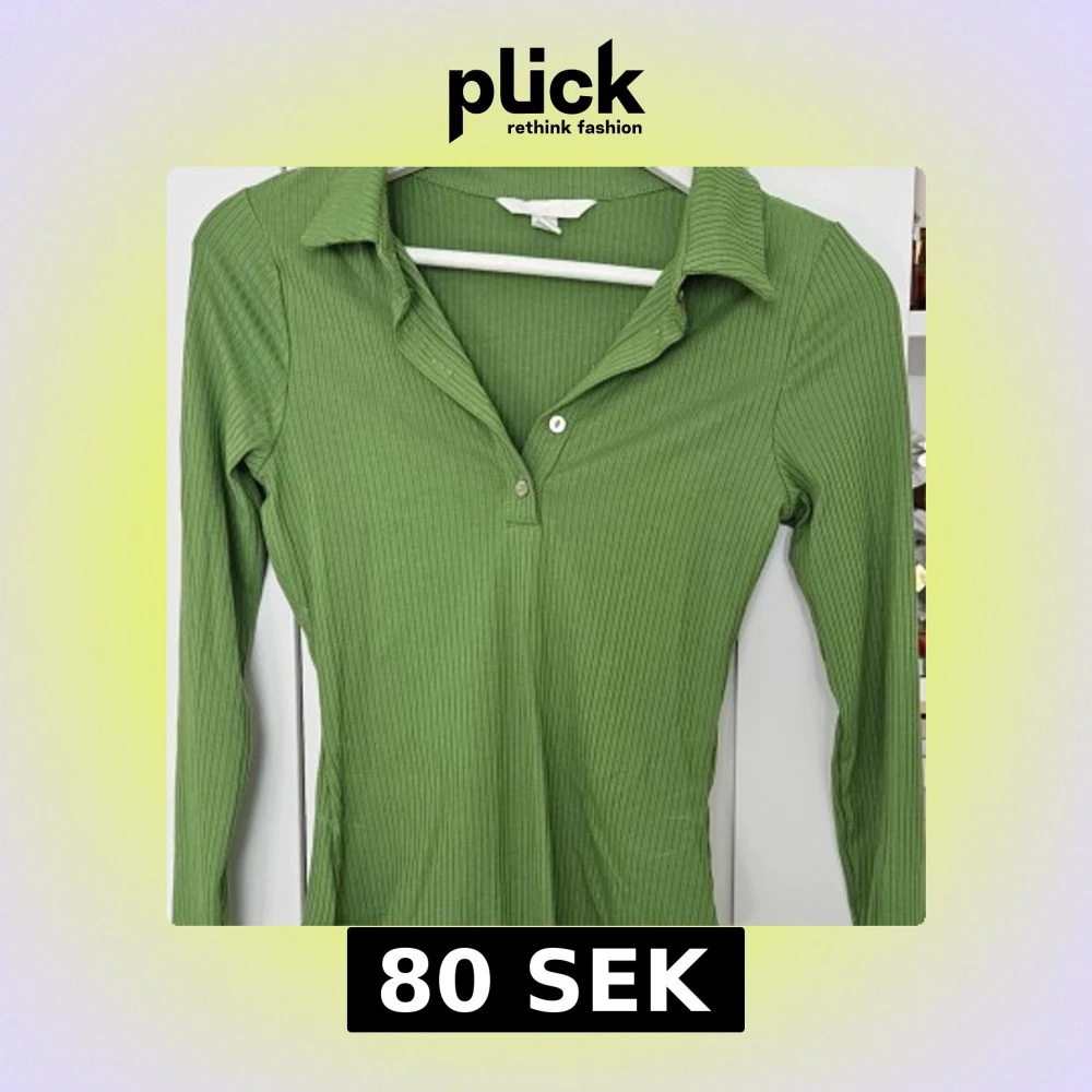Snygg grön ribbad pikétröja med lång ärm och klassisk krage. Tröjan har två knappar framtill och är figurnära i modellen. Perfekt att styla till jeans eller kjol.