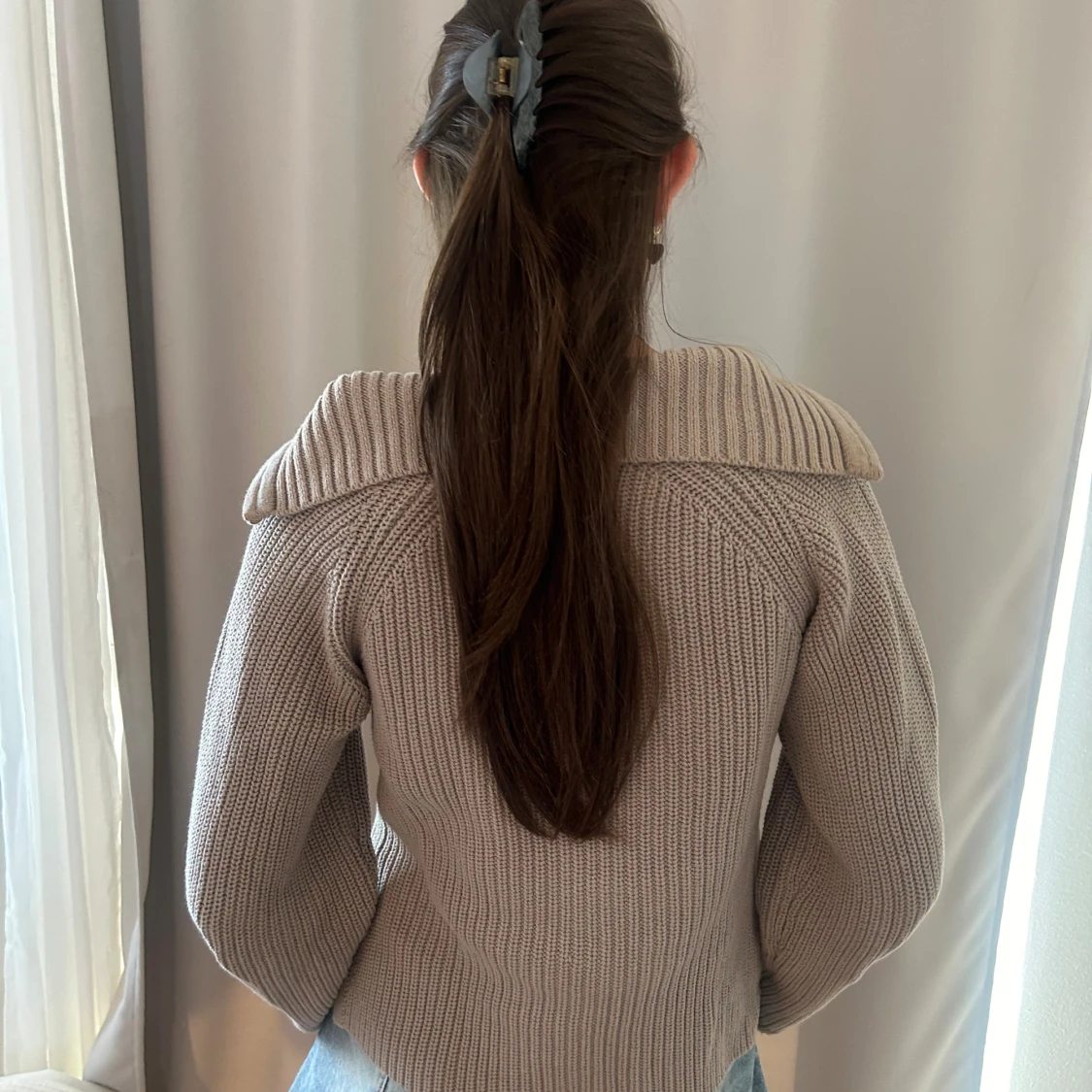Säljer en beige stickad tröja med grov ribbstickning och hög krage. Tröjan har en snygg half zip-dragkedja framtill och långa ärmar. Perfekt för lager-på-lager och chill höststil.
