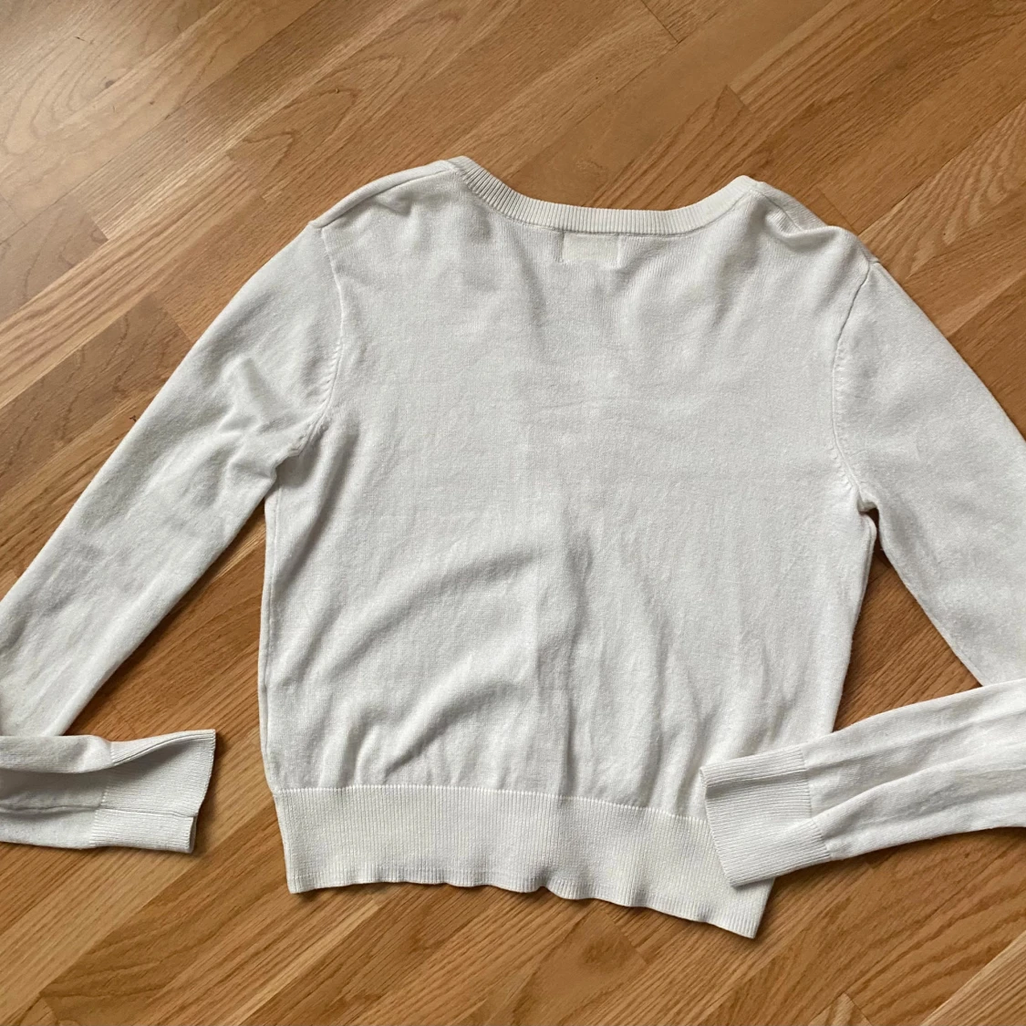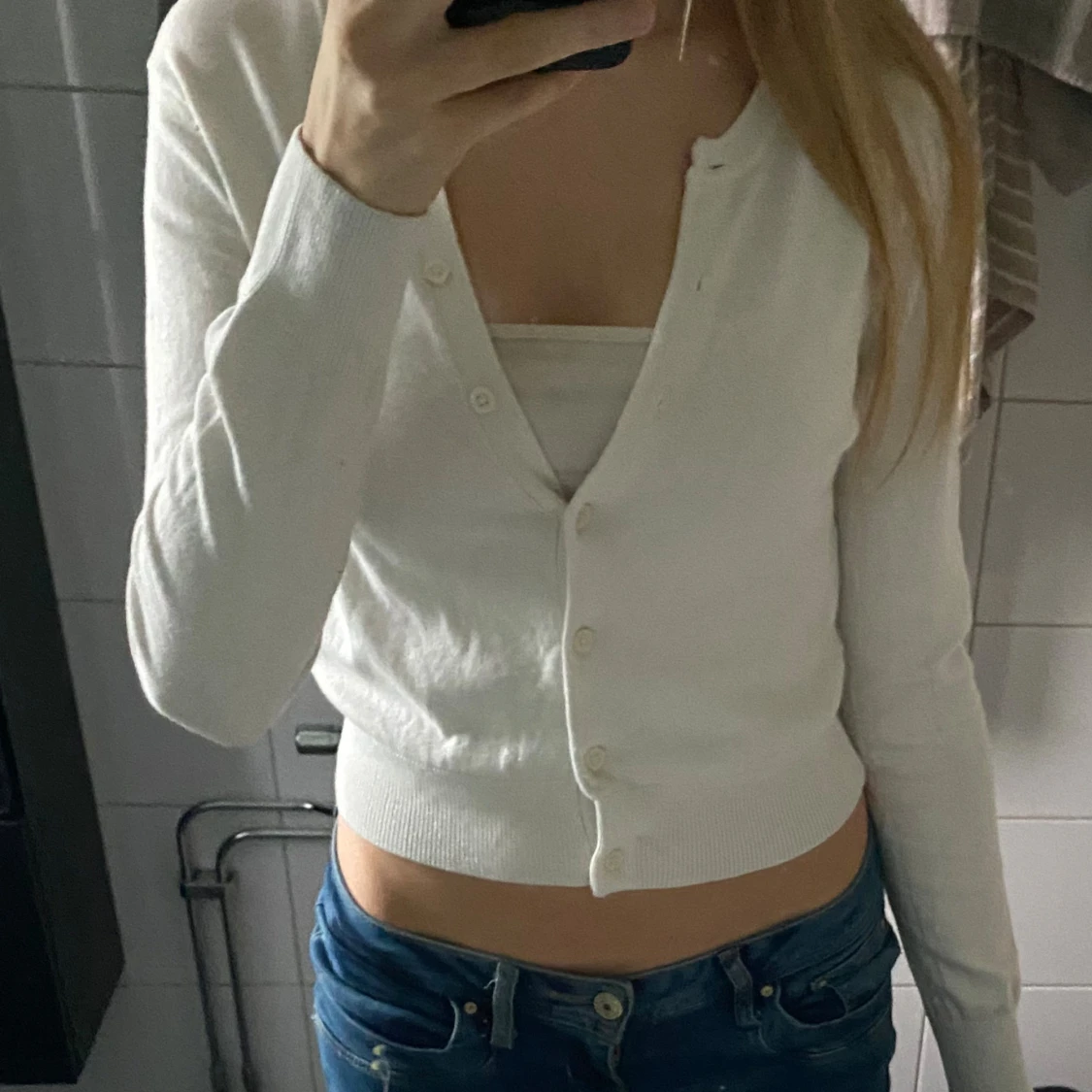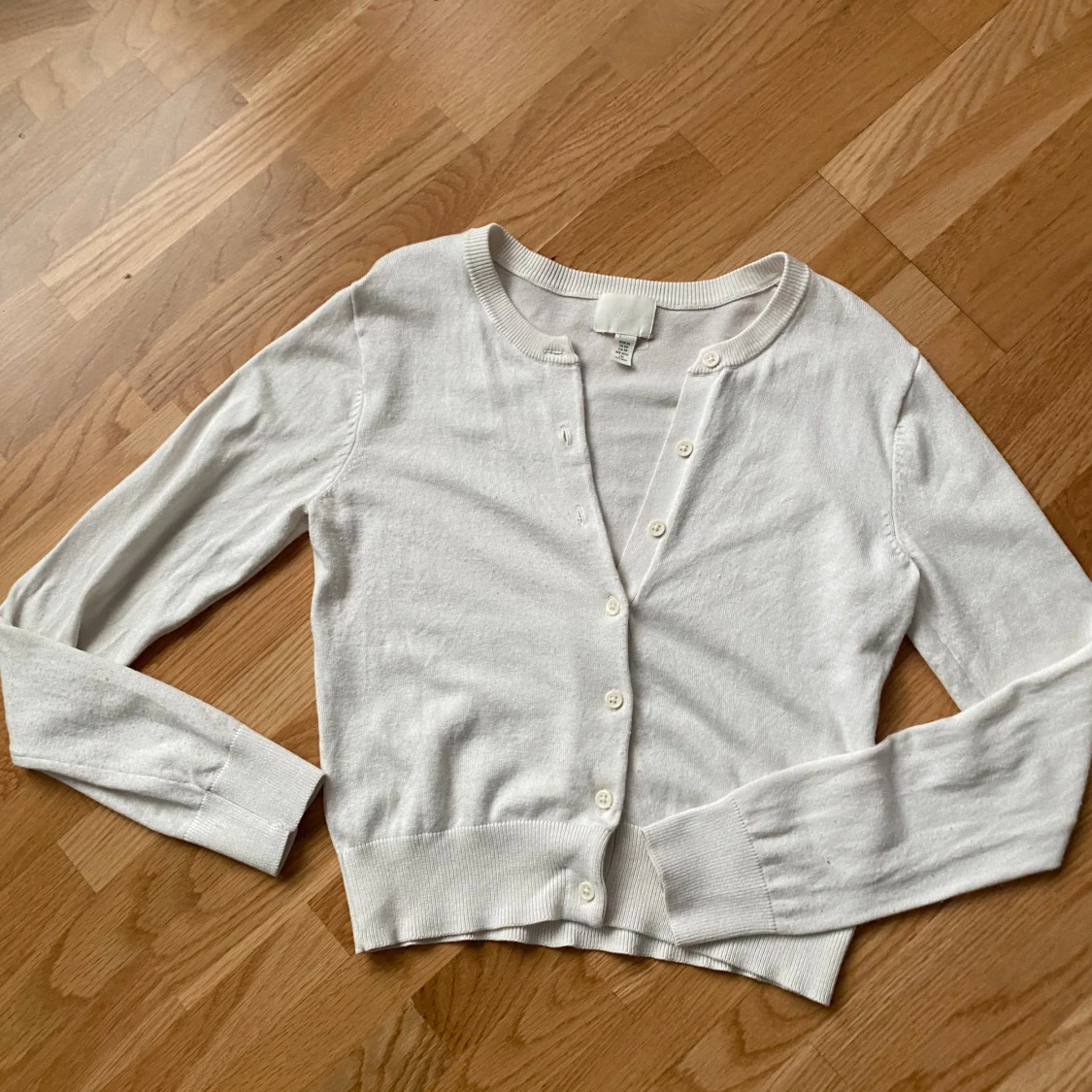 Snygg vit kofta från H&M i storlek XS. Modellen är croppad med långa ärmar och knappar framtill. Perfekt att slänga över ett linne eller t-shirt. Mjuk och tunn, passar bra till både jeans och kjol.