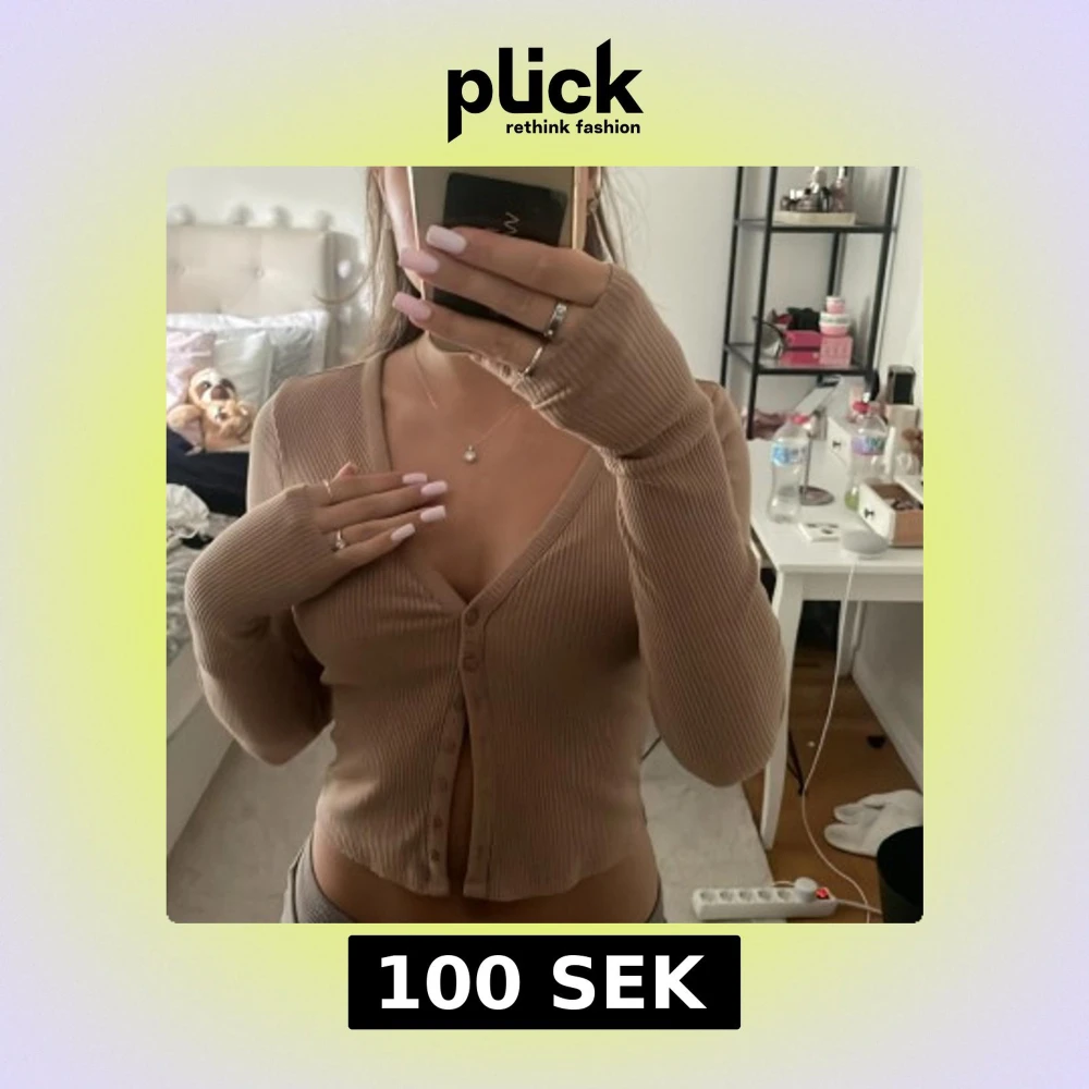 Säljer en beige ribbad kofta med v-ringning och knappar framtill. Tröjan är croppad och har långa ärmar som sitter snyggt. Perfekt att styla med jeans eller kjol för en chill och trendig look.