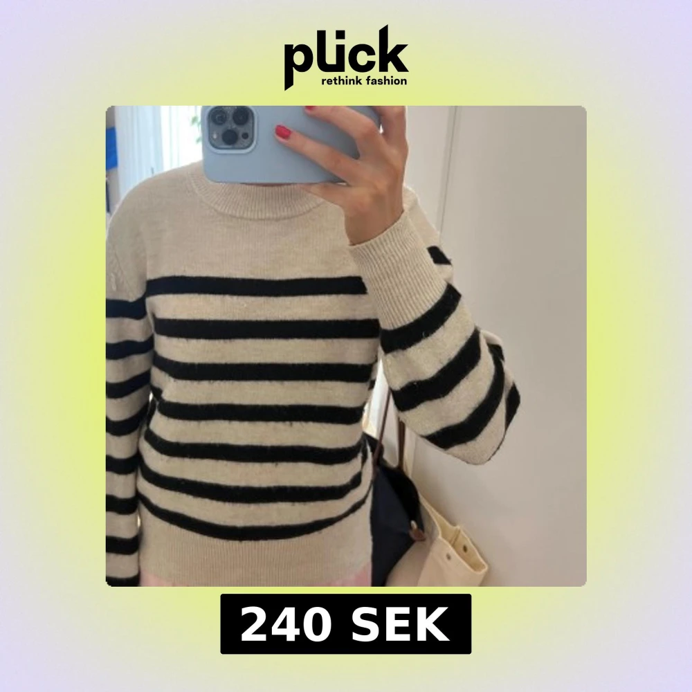 Säljer en snygg randig tröja i beige och svart. Tröjan har långa ärmar och en klassisk rund halsringning. Perfekt för en stilren och avslappnad look.