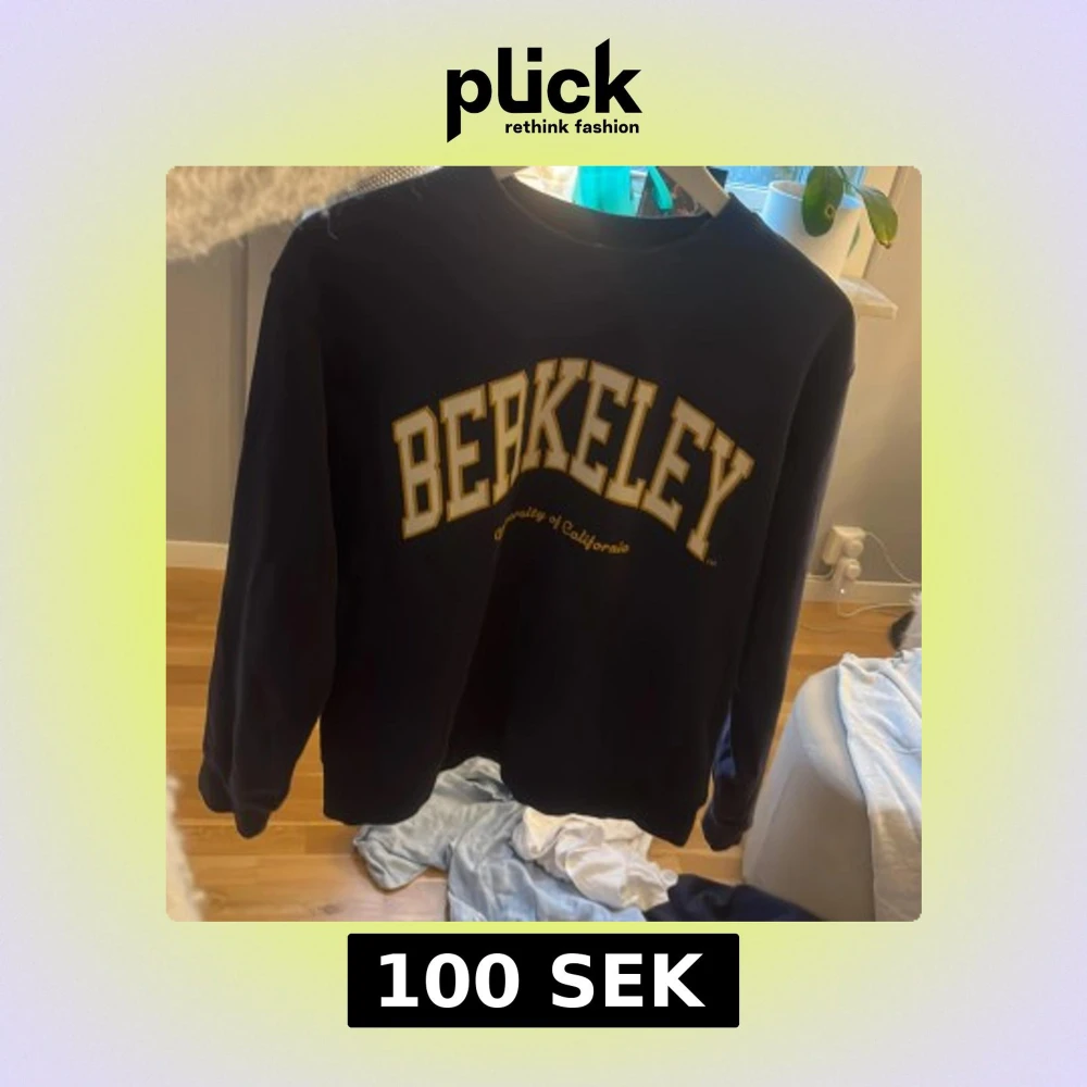 Collegeinspirerad svart sweatshirt från H&M med stort BERKELEY-tryck i vitt och gult på bröstet. Rund hals, långärmad och tillverkad i mjuk bomullsmix. Perfekt för dig som gillar klassisk amerikansk universitetsstil.