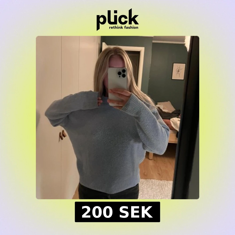 Supermysig ljusblå stickad tröja från H&M i storlek XS. Tröjan har en klassisk rund halsringning med ribbade muddar.