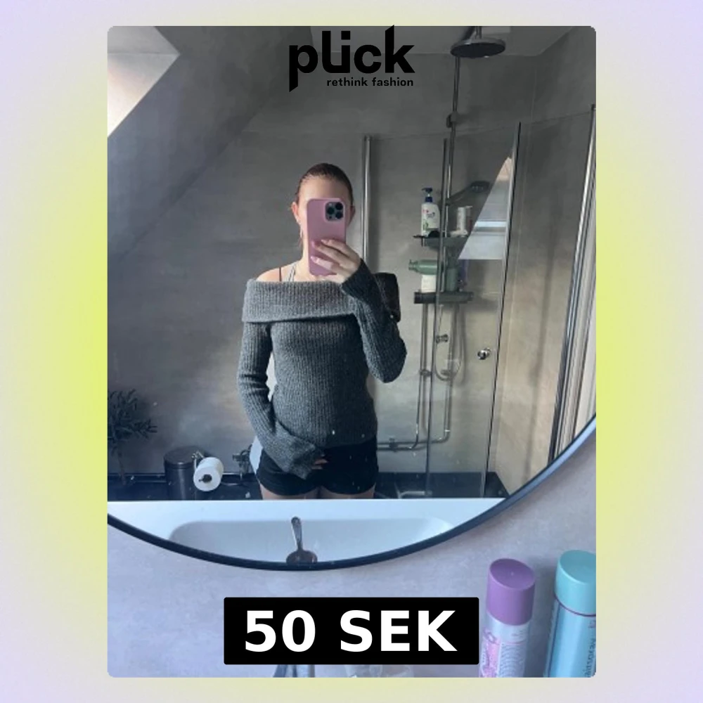 Mysig grå stickad tröja med ribbat mönster och offshoulder-design. Tröjan har långa ärmar och en bred krage som vilar snyggt över axlarna. Perfekt för dig som vill ha en trendig och bekväm look under kyligare dagar.