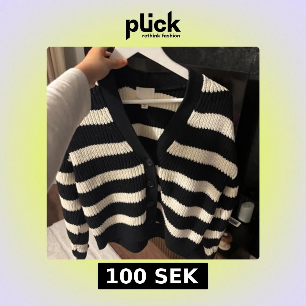 Säljer en ribbstickad kofta från H&M med breda svarta och vita ränder. Koftan har v-ringning, knappar framtill och långa ärmar. Endast testat den.