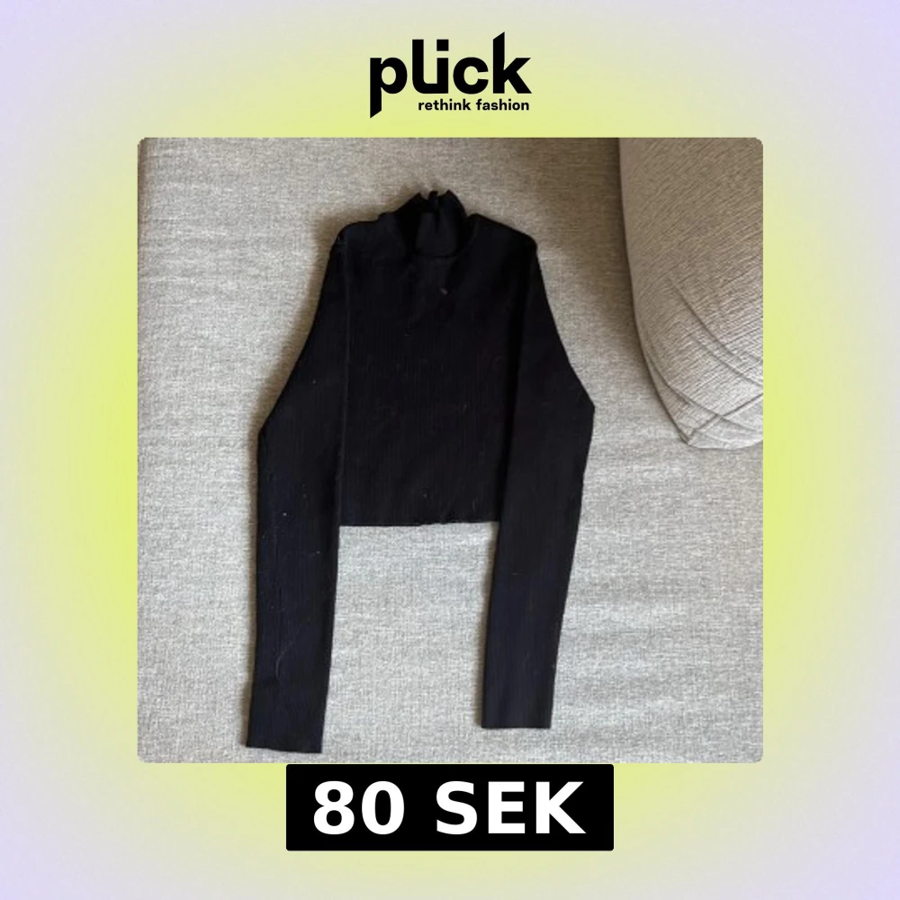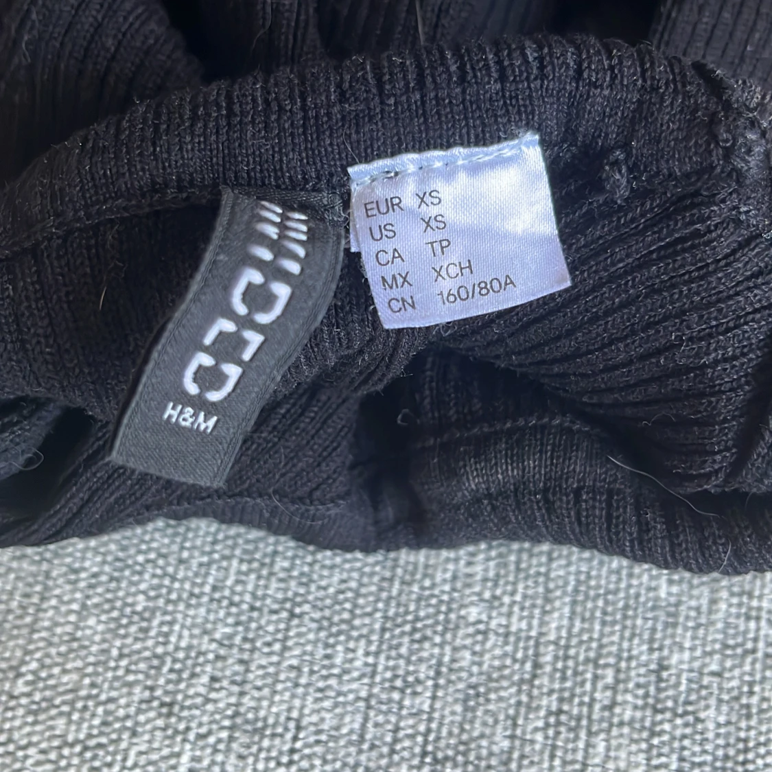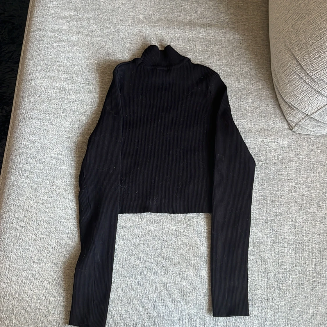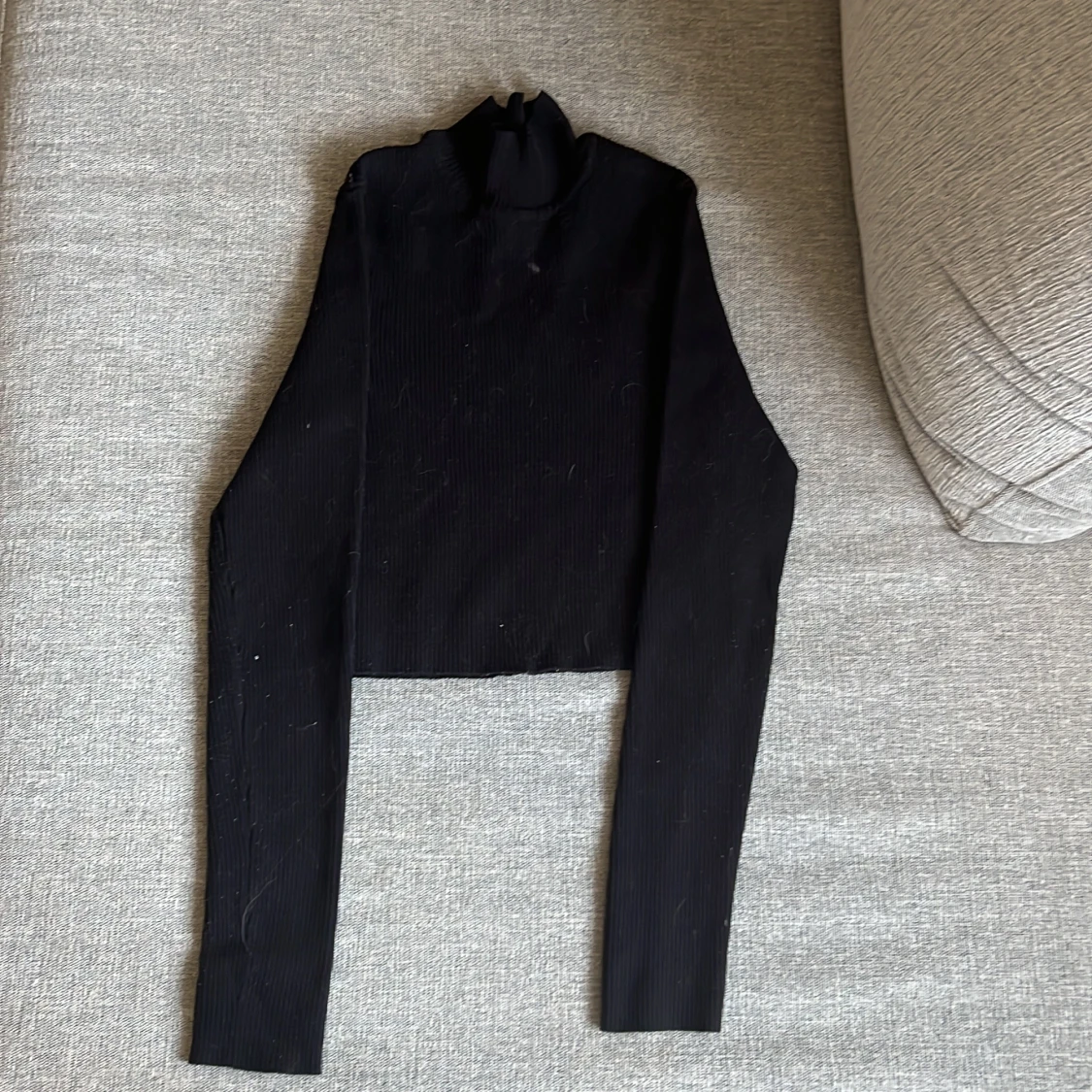 Svart ribbad croppad polotröja från H&M i storlek XS. Tröjan har lång ärm och hög krage, perfekt att styla med jeans eller kjol. Materialet är mjukt, tjockt och stretchigt, vilket gör den riktigt bekväm och snygg till kyliga dagar. Plagget kommer rullas innan den fraktas iväg.