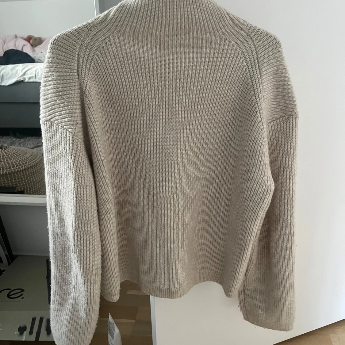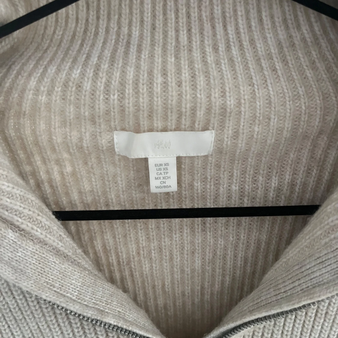 Beige ribbstickad tröja från H&M i storlek XS. Tröjan har hög krage och en snygg half zip-dragkedja framtill.