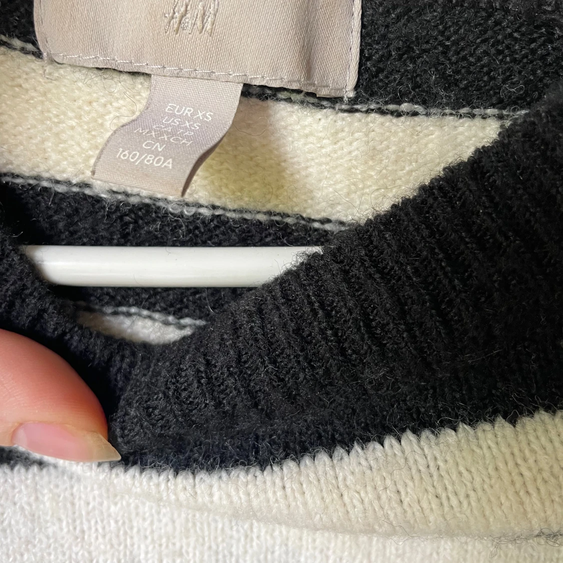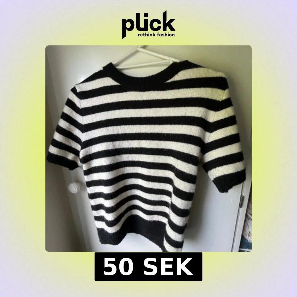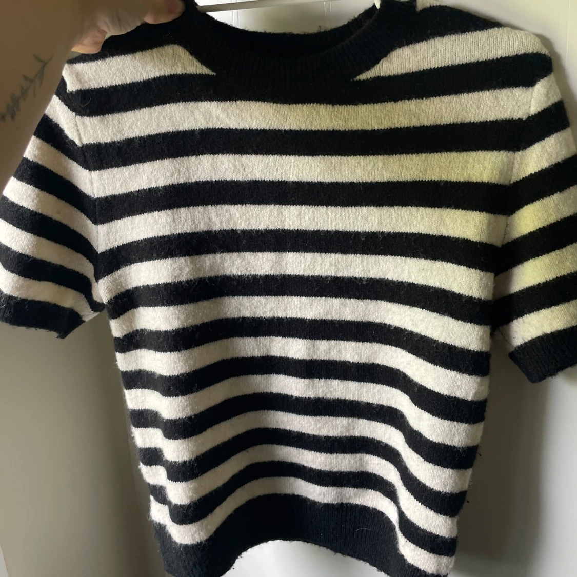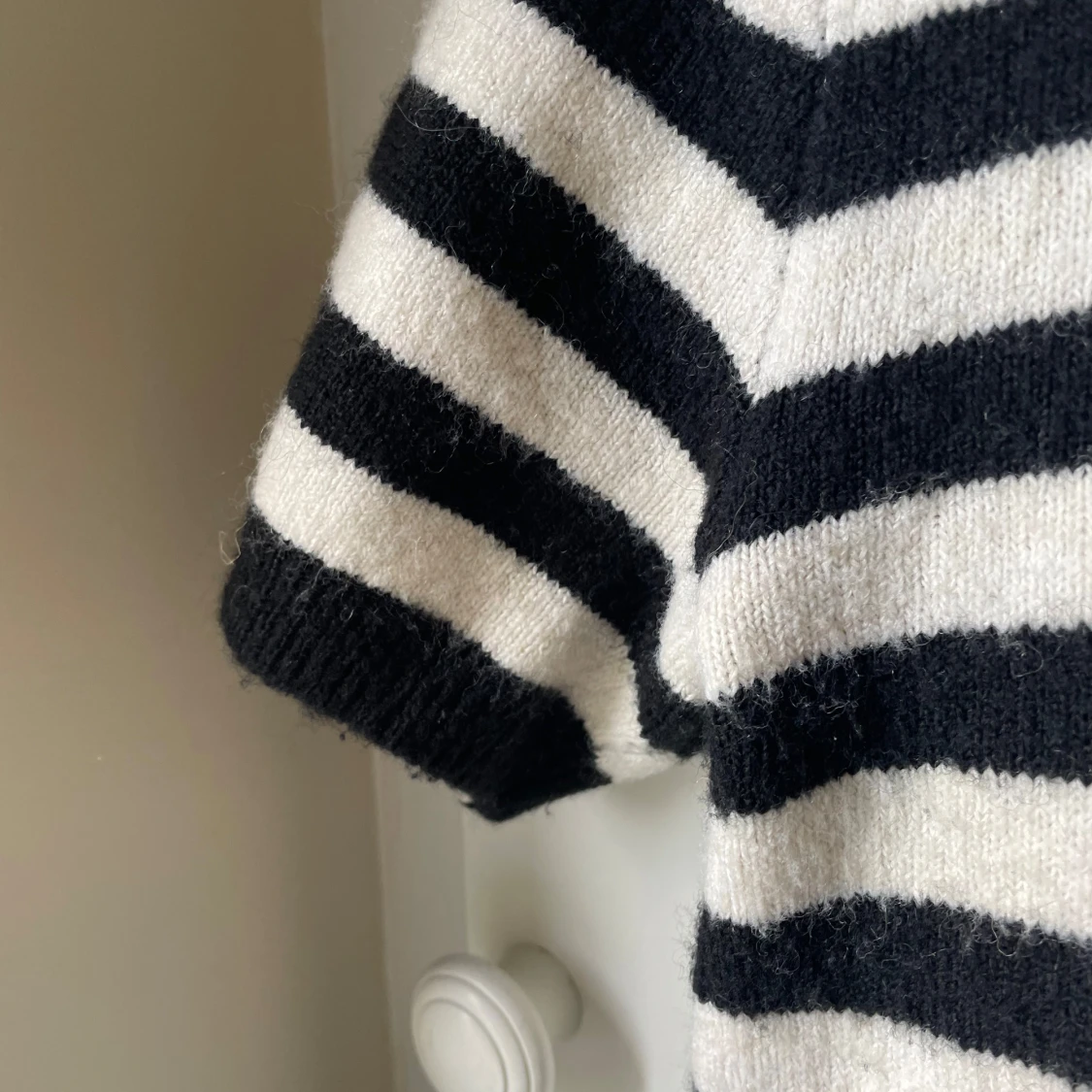 Snygg stickad tröja från H&M i storlek XS med svartvita horisontella ränder. Tröjan har korta ärmar, rund halsringning och är gjord i ett mjukt, stickat material. Perfekt för dig som gillar klassisk stil med en twist.