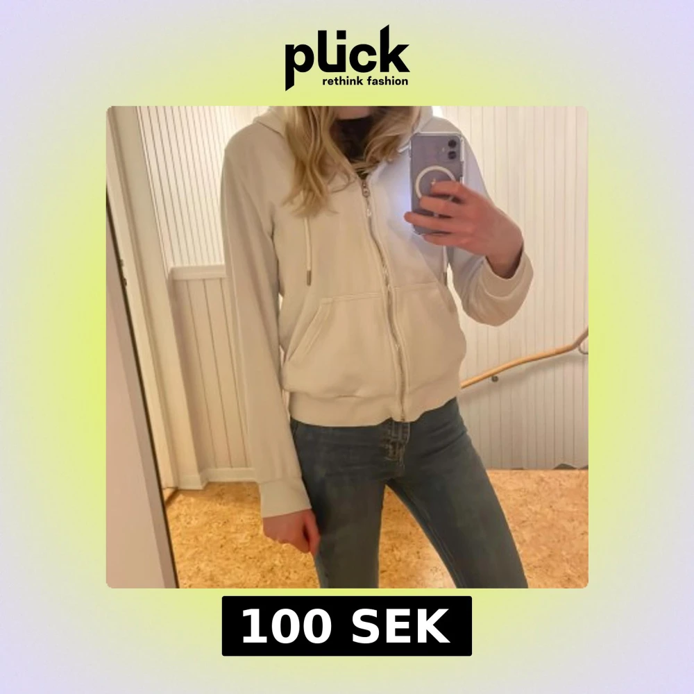 Säljer en stilren vit hoodie med dragkedja och fickor framtill. Perfekt för en avslappnad look. Den har långa ärmar och en bekväm huva. 💕