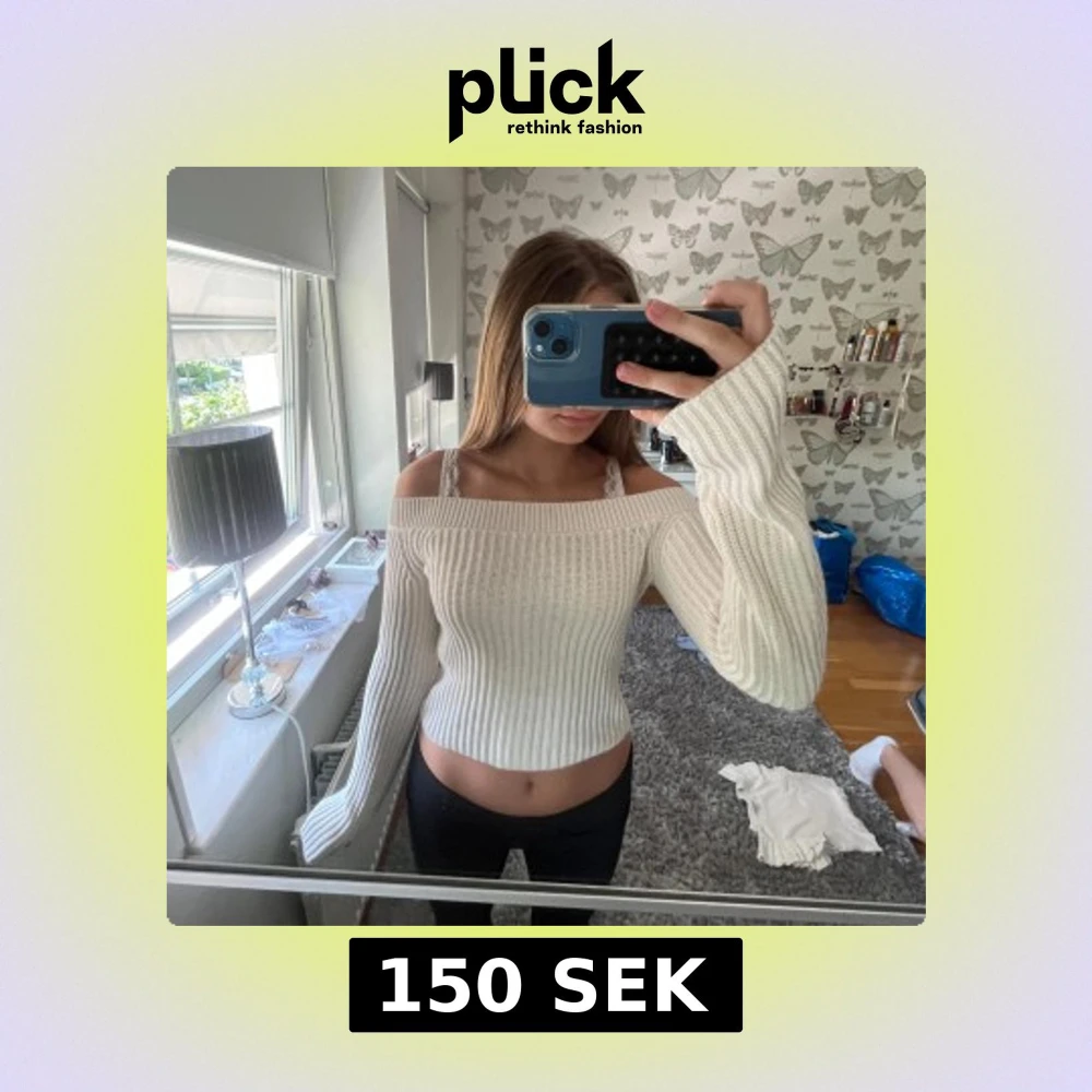 Superfin offshoulder stickad tröja i ljusbeige med ribbad struktur. Tröjan är croppad och har långa ärmar. Super snygg💕