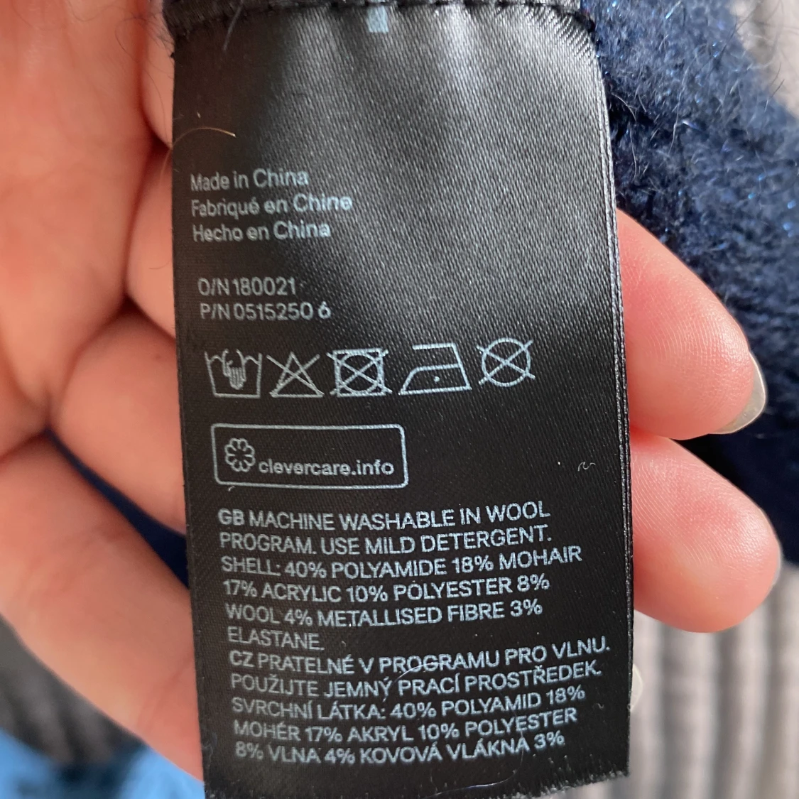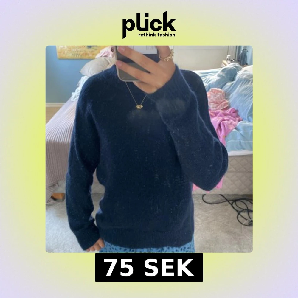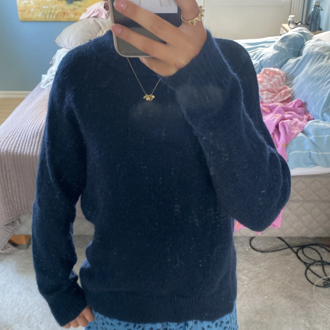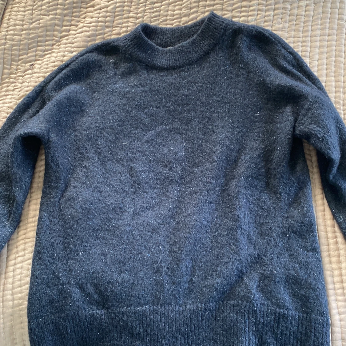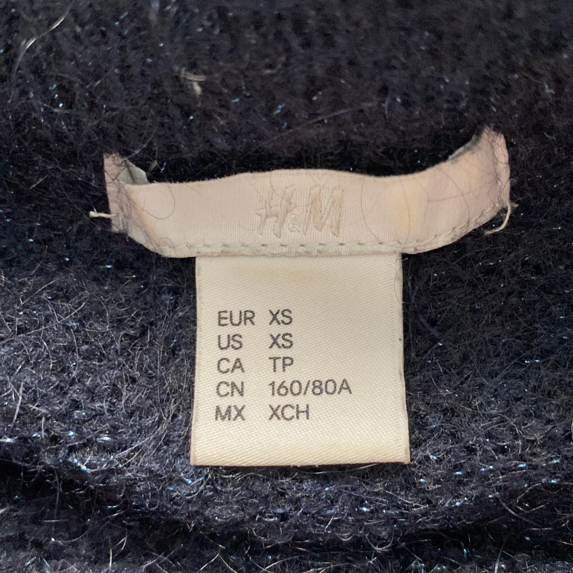 Mysig mörkblå stickad tröja med lite glitter i från H&M i storlek XS. Tröjan har rund halsringning, långa ärmar och är tillverkad i en blandning av mohair, ull, akryl och polyester. Perfekt för kyliga dagar och enkel att matcha med jeans eller kjol.