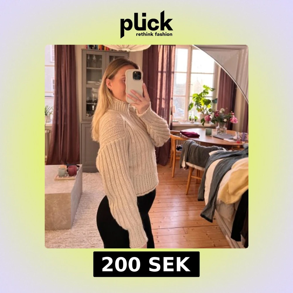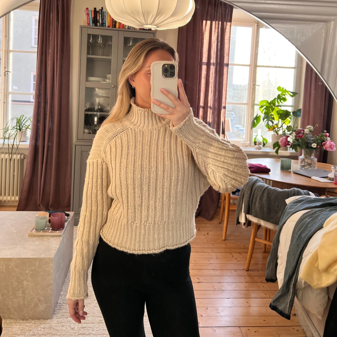 Säljer en mysig beige stickad tröja med hög krage. Tröjan har långa ärmar och en ribbad design som ger en stilren look. Perfekt för kyligare dagar!