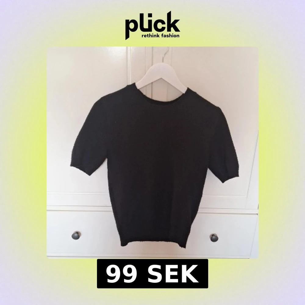 Säljer en stilren svart tröja med korta ärmar. Perfekt för en minimalistisk look. Tröjan har en rund halsringning och är gjord i ett mjukt material.