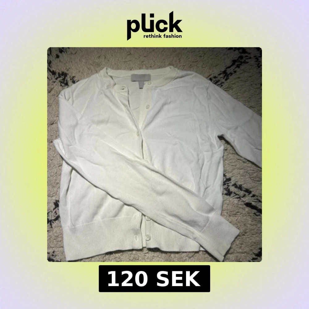 Snygg vit kofta från H&M. Klassisk rund halsringning och långa ärmar. Koftan har knappar framtill och ribbade muddar vid ärmslut och nederkant. Perfekt att slänga över en t-shirt eller linne för en chill look.