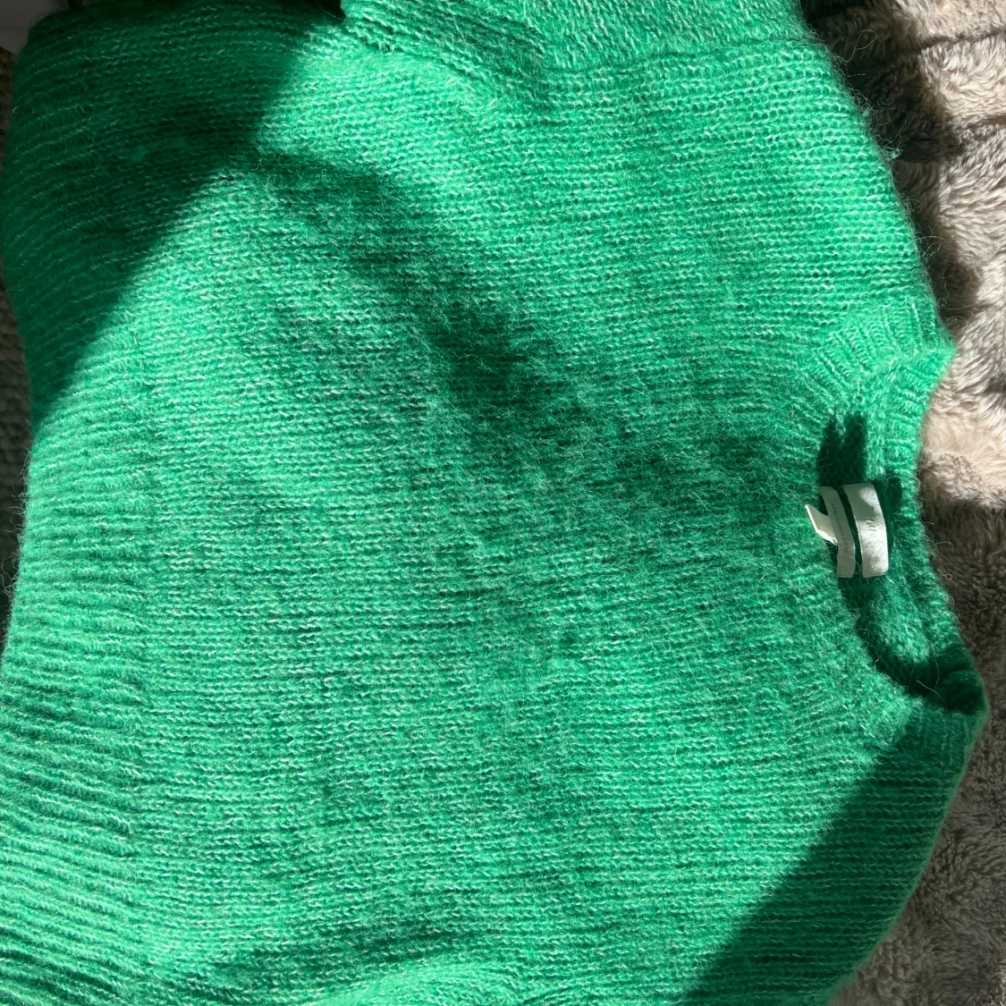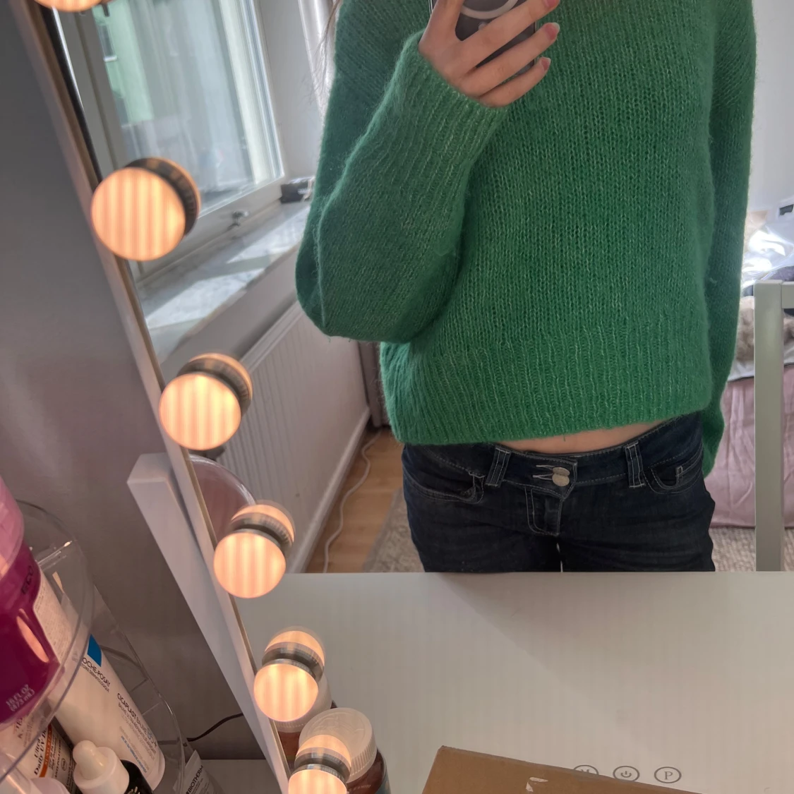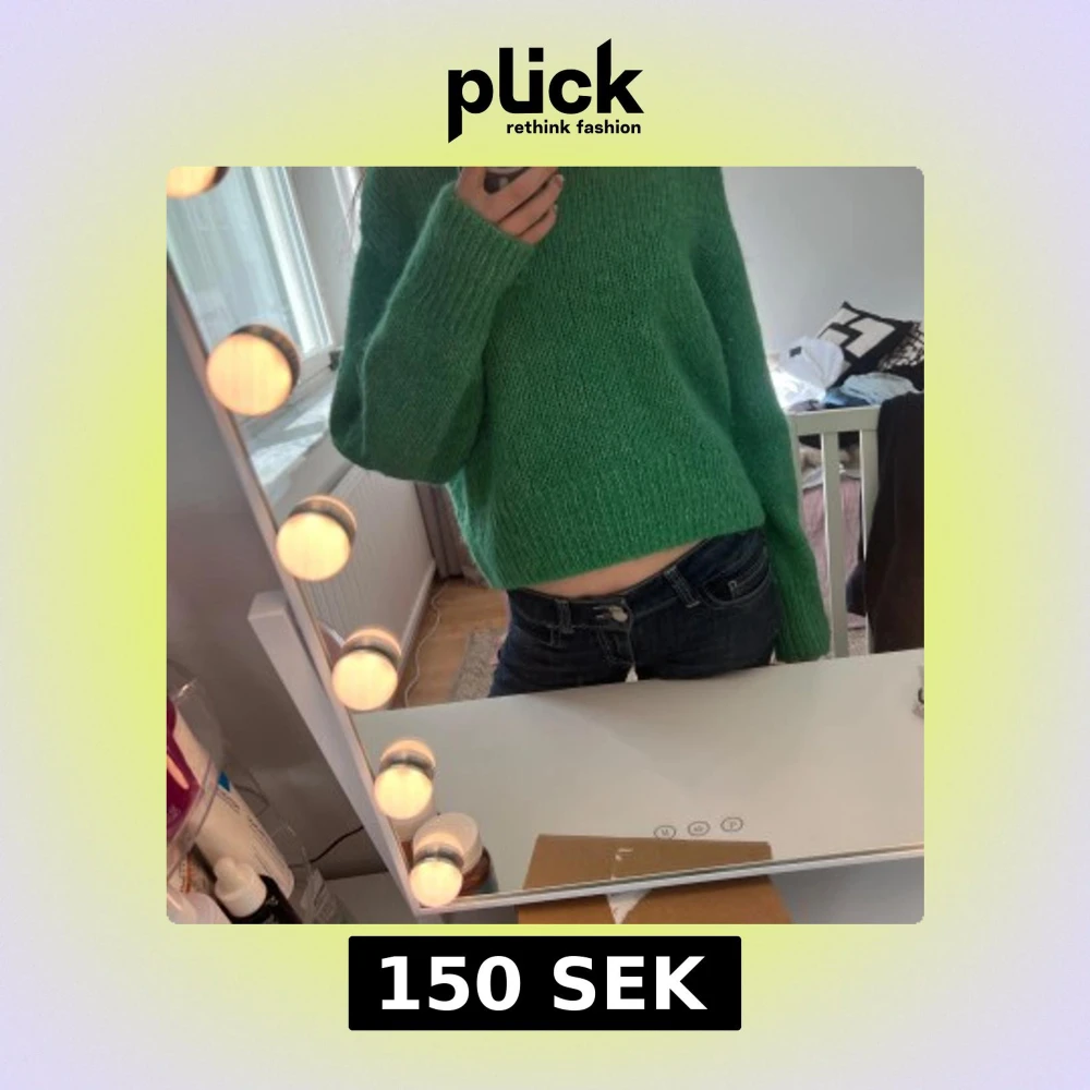 Säljer en mysig grön stickad tröja med långa ärmar. Perfekt för kyligare dagar och ger en skön och avslappnad look. Tröjan har en enkel design som gör den lätt att matcha med olika outfits.