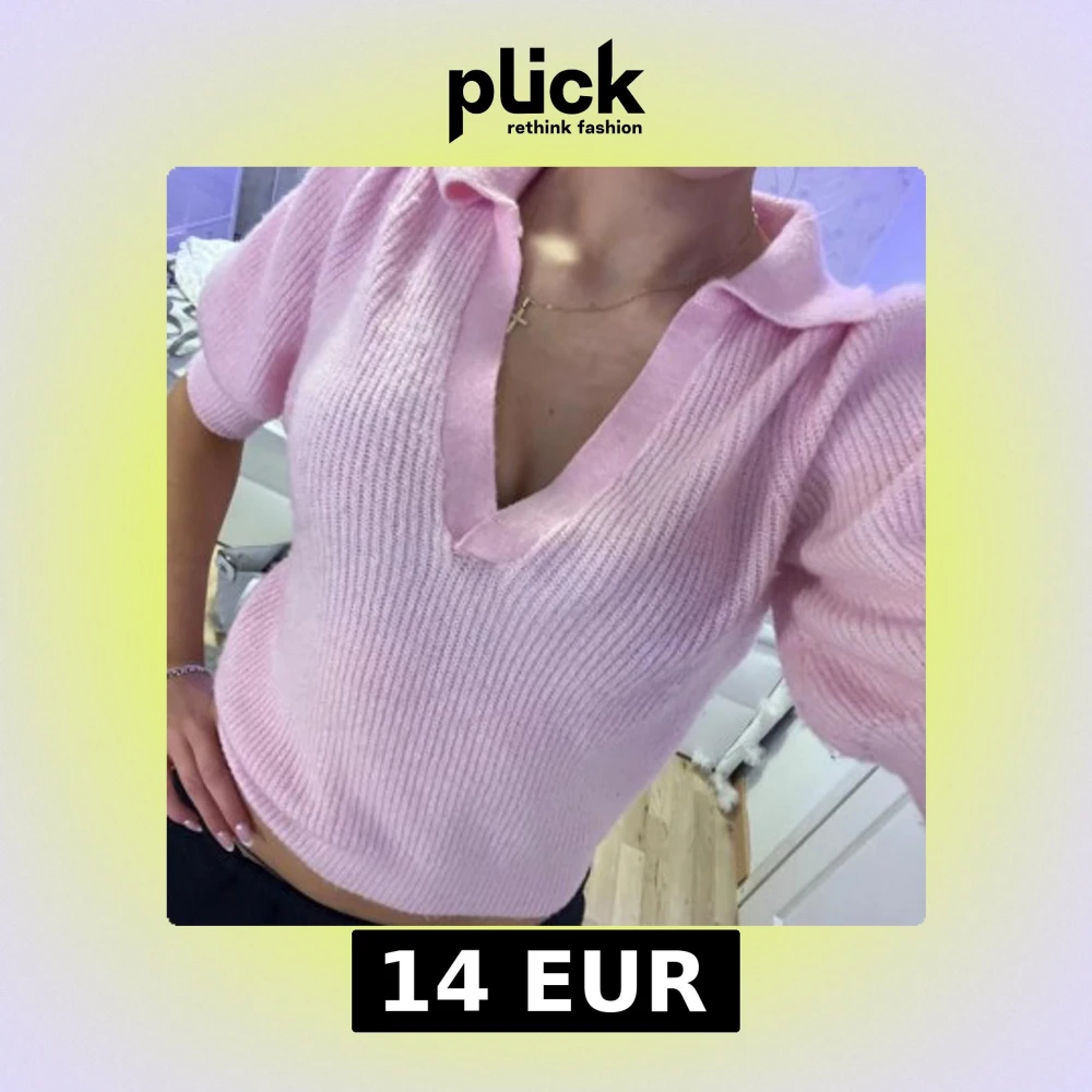Säljer en söt rosa stickad tröja från H&M med en v-ringad design och krage. Tröjan har korta ärmar och en bekväm passform. Om du har frågor, vänligen kontakta mig på engelska.🥰🥰