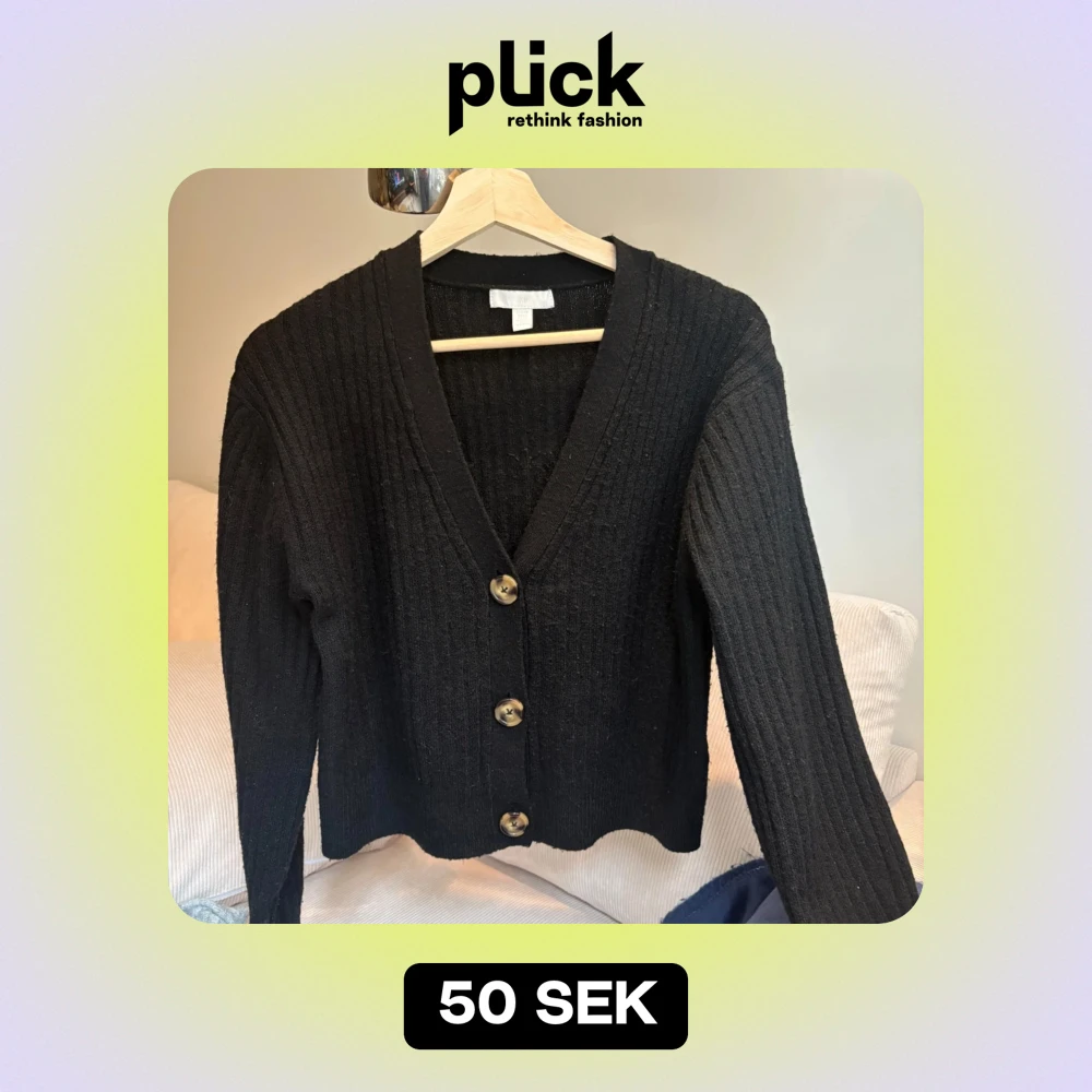 Säljer en svart ribbad kofta med stora knappar framtill. Den har en v-ringad design och långa ärmar, perfekt för höst och vinter. Koftan är i mycket bra skick!