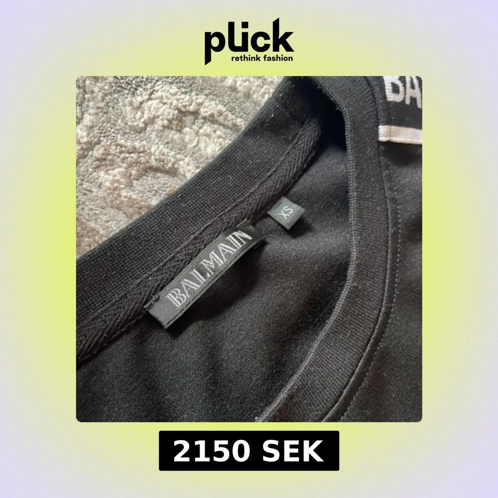 Snygg svart sweatshirt från Balmain i storlek XS. Tröjan har Balmain Paris-tryck framtill och logga längs ena ärmen. Klassisk rund halsringning och långa ärmar. Perfekt för dig som vill ha en stilren och trendig look.