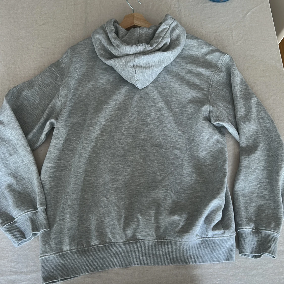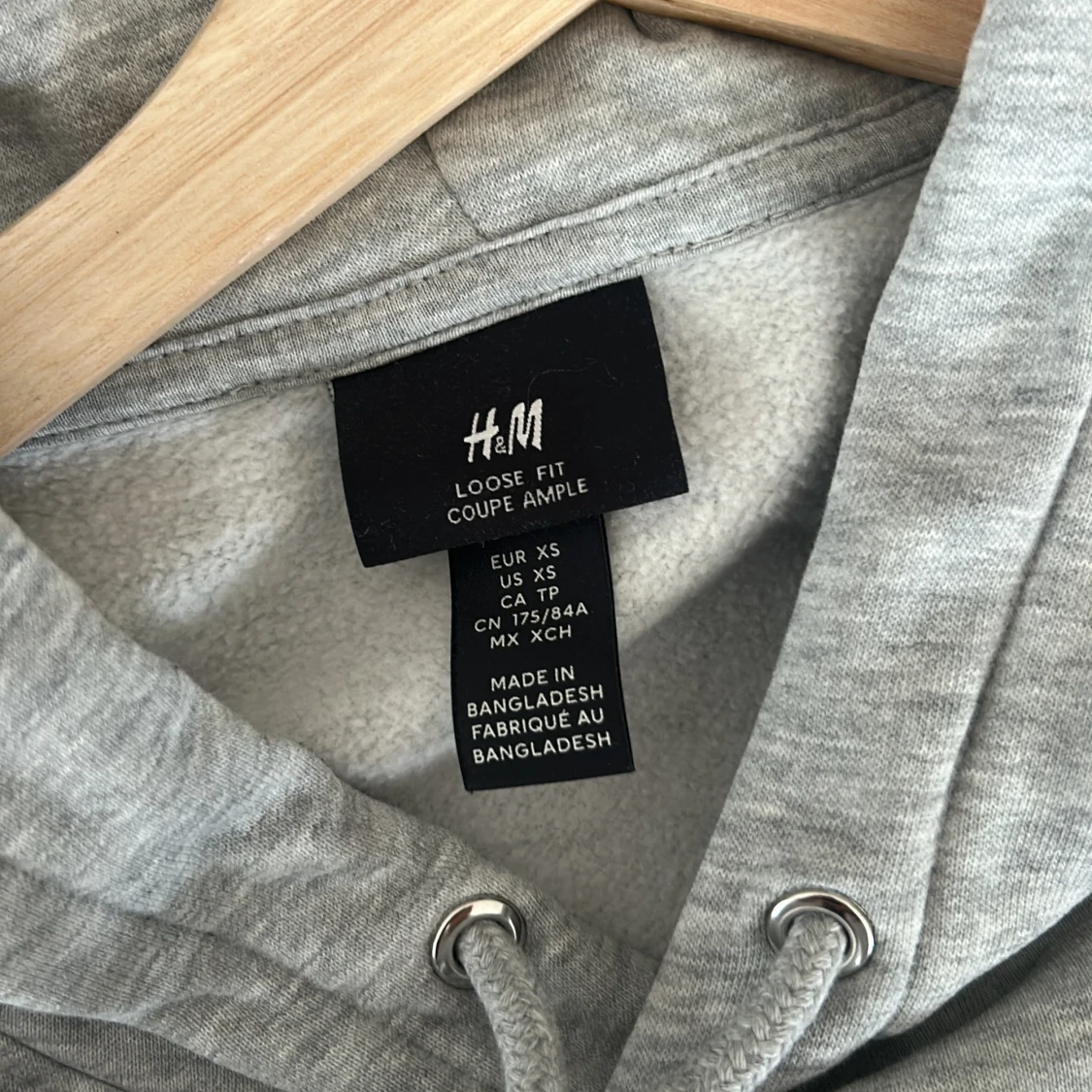 Säljer en grå hoodie från H&M i loose fit-modell, storlek XS. Tröjan har huva med snörning, magficka och ribbade muddar vid ärmslut och nederkant. Perfekt för chill dagar och enkel att matcha med jeans eller mjukisbyxor.